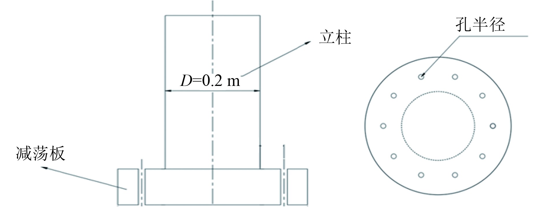 近年来,国内外学者已尝试在垂荡板的尺寸、板的厚度、边缘形状、板的形状、板的开孔率等方面对其展开研究。张帆[4]通过模型试验,研究了不同数目和形式的垂荡阻尼板对平台垂荡运动性能的影响,增加垂荡板的数目、减小垂荡板间距能够有效增加平台垂荡附加质量,Wadhwa等[5]通过实验方法研究了自由表面对水动力阻尼和附加质量的影响。在水中,附加质量系数和阻尼系数比深水中获得更大的值。其中减荡板的几何参数(如开孔形式、倒角角度)和环境参数(如周期、KC数)对其水动力性能的影响受到广泛关注。本文选取不同开孔倒角形式的减荡板为研究对象,结合数值模拟与试验方法,分析其附加质量系数和阻尼系数随KC数的变化规律,研究结果将为后续风机浮式基础减荡装置的优化设计提供重要参考。