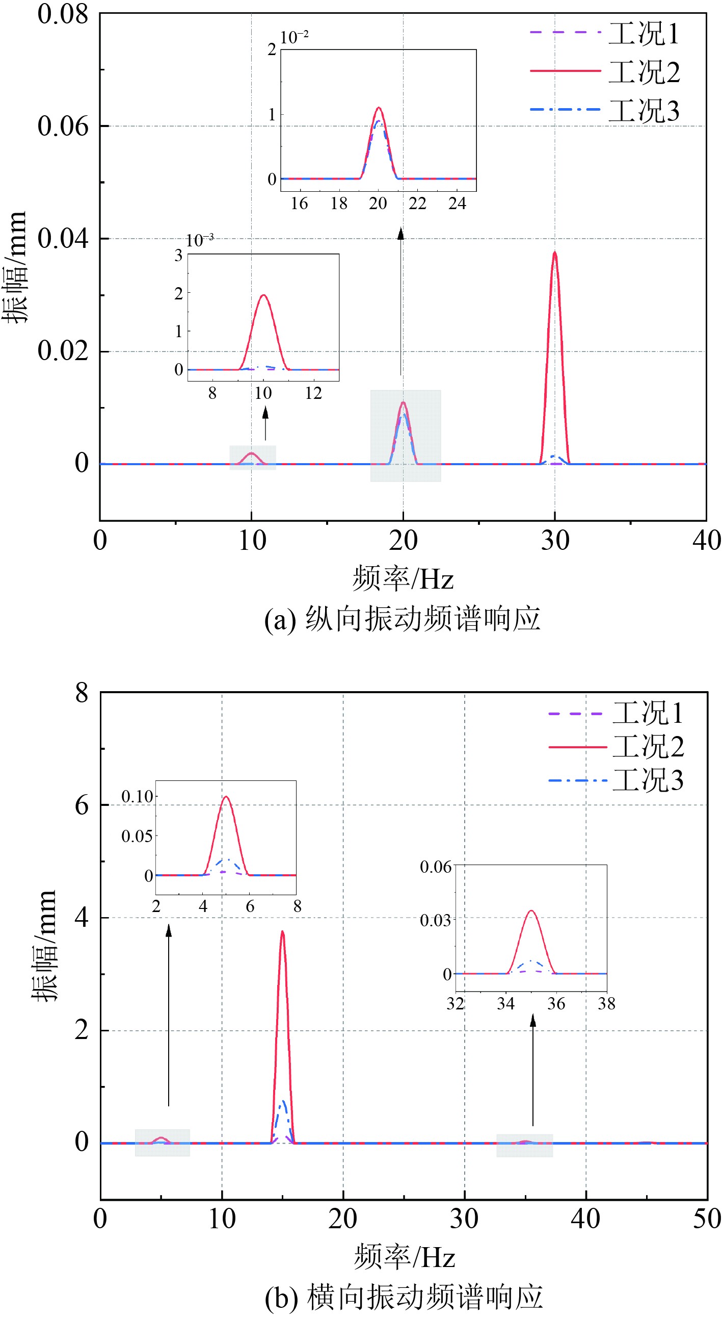 综上所述,纵向激励频率对横向振动的影响比横向激励频率对纵向振动响应更小,相同振动方向下不同频率的振动响应受激励频率变化的影响不同。