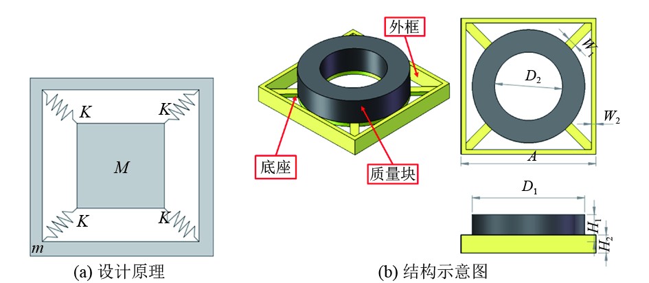 图 1 低频吸振器设计原理及结构示意图 Fig. 1 Design principle and structure diagram of low frequency vibration absorber |