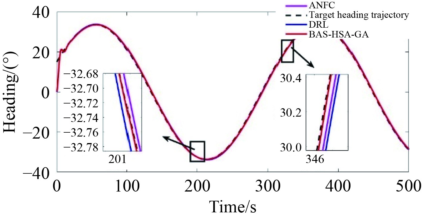 进行S型轨迹跟踪实验时,对比了BAS-HSA-GA算法、深度学习算法(DRL)和自适应模糊神经网络算法(ANFC)。所有实验均设定初始航向角为0°,相应结果如图14、图15和表10所示。通过这些对比,旨在评估不同控制方法在轨迹跟踪任务中的性能。