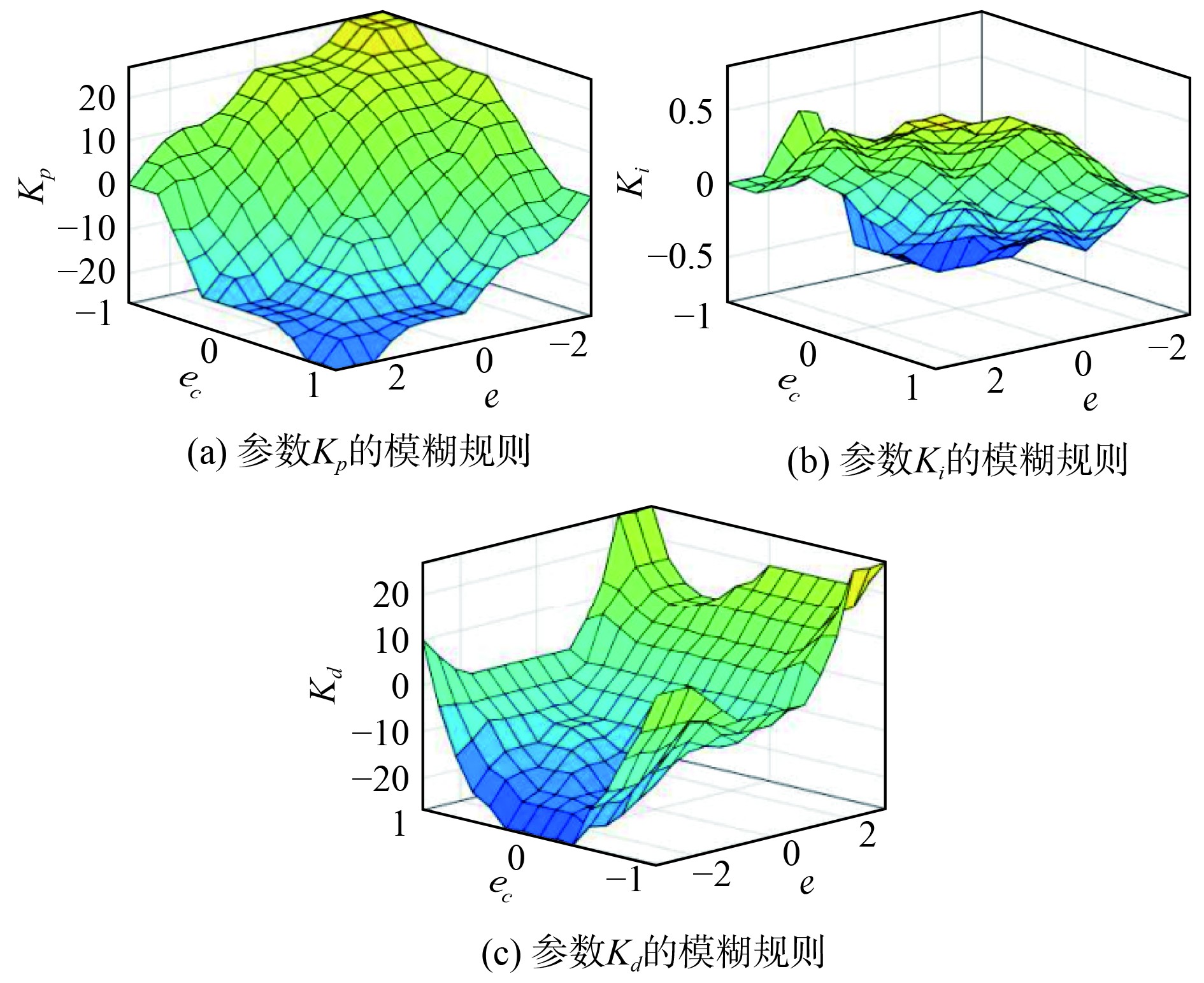 为便于分析,设定偏差e和偏差变化率ec的论域均为 [−3, 3],控制参数Kp、Ki和Kd的论域同样为 [−3, 3]。所有变量的隶属函数采用常见的三角形隶属度函数进行描述。