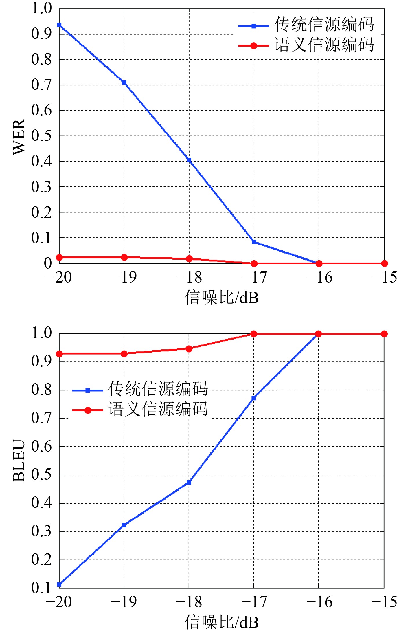 将相同的信源信息分别经过基于神经网络的语义信源编码和传统信源编码后,进行信道编码、调制等处理后生成水声信号,通过不同信噪比条件下的水声信道后,再分别对应通过基于神经网络的语义信源译码和传统信源译码后得到译码后的信息。对比译码信息与原始的信源信息,得到水声信道中不同信噪比条件下基于神经网络的语义信源编码与传统信源编码的WER和BLEU曲线,如图8所示。