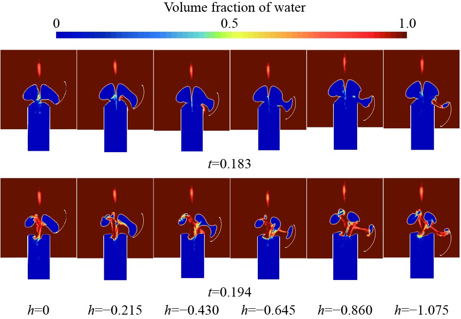 图5为h = 0工况下,航行体离开筒口过程中筒口附近的水体积分数、压力场和温度场演化云图,可以清楚地观察到高温高压气体与水环境作用过程。结合图4,t=0时,航行体出筒,筒内气体迅速涌出筒口,高温高压气团快速膨胀,并作用于筒盖下端,施加正向载荷。期间,筒口气团温度不断降低,压力开始快速降低且低于水环境,逐渐产生相对于水环境的负压力场,筒盖开始承受反向载荷,如t = 0.085时所示。随后,在t = 0.153~0.170过程中,航行体尾部气团与筒口气团分离,重力场作用逐渐显著,筒口气团开始发生收缩,根据理想气体状态方程,气团压力和温度开始回升,与此同时,筒盖外侧压力也快速恢复,使筒盖承受的反向载荷继续增大,气团开始出现断裂现象。当t = 0.183状态时,气团体积继续收缩,温度和压力也不断升高,并在断裂处发生小范围溃灭,反向载荷达到峰值开始减小,气团发生完全断裂。在t = 0.194时,筒口气团温度和压力达到阈值,发生大范围溃灭,筒口上方压力骤升,筒盖正向载荷快速升高并达到峰值。能量释放完毕后,多余的气团在重力场作用下上浮,筒口压力和温度恢复至环境值,如t = 0.256所示。