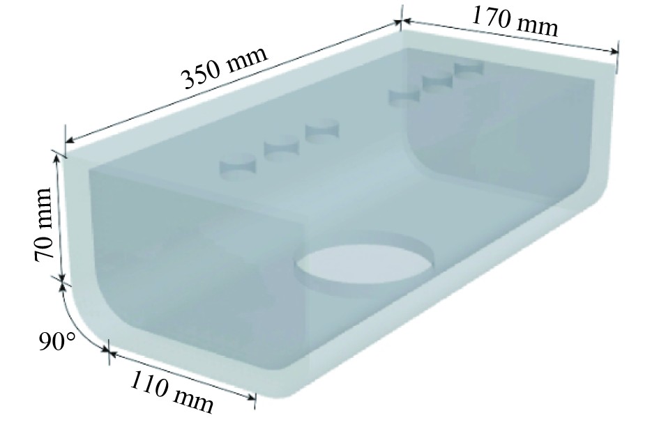 通过模拟文献[21]的浮体淹没实验来验证本文的数值模拟方法的有效性。浮体破口位于底部中央,浮体上方设有6个相同大小的通风口。实验在一个长方形水池中进行,水池的长和宽均为500 mm,水深为400 mm。浮体用细绳通过定滑轮水平悬挂在水面上方,浮体底部与水面相接触,随之剪断细绳,浮体下落,通过高速摄影机捕捉浮体的淹没过程。浮体模型参数如表1所示。建立好的破损浮体模型如图1所示。