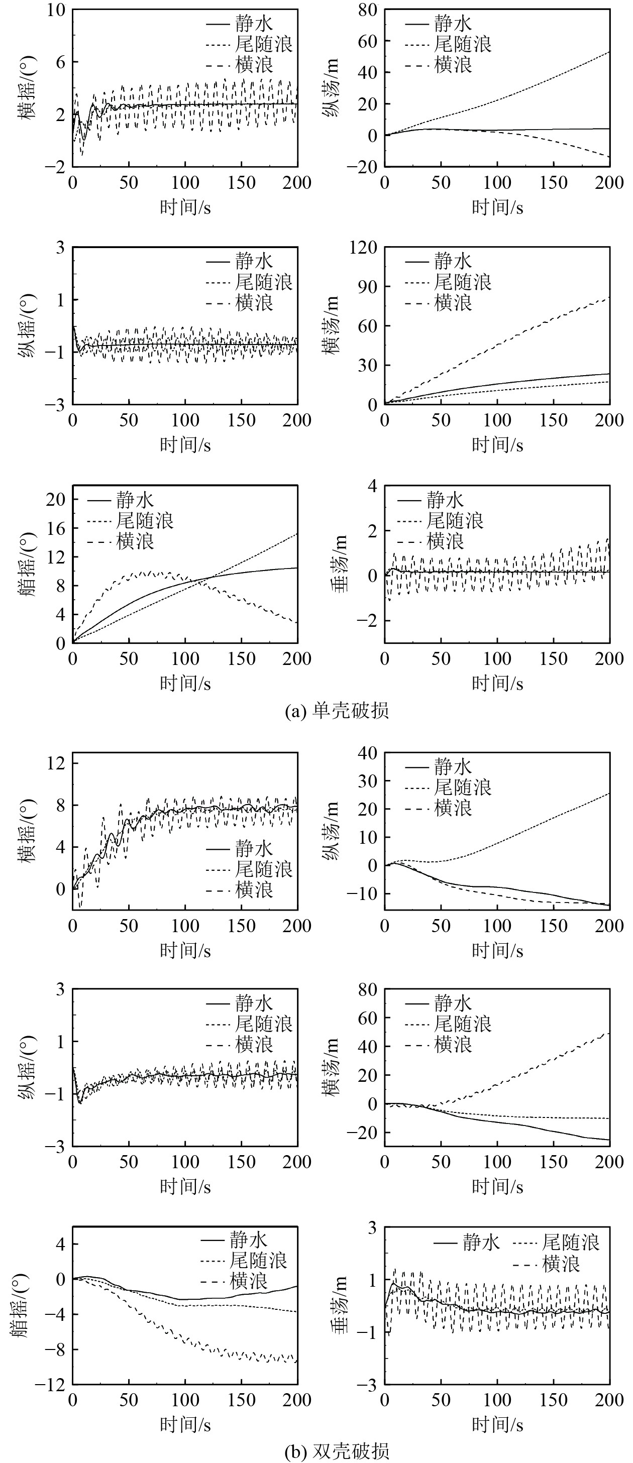 5) 单、双壳破损时,横浪下的横荡值增长最快,呈现向左舷方向运动的趋势,且单壳破损时比双壳破损时的横荡值增长更快。单、双壳破损在静水和尾随浪下的横荡方向相反,单壳破损时,呈现向左舷偏移的趋势,双壳破损时,呈现向右舷方向运动的趋势。