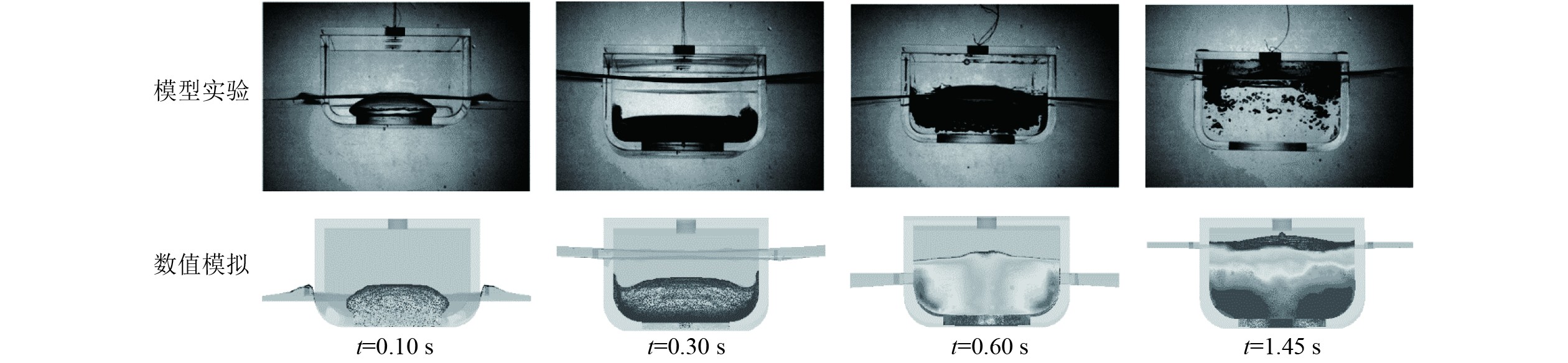 通过数值模拟监测破损浮体的进水过程和垂向速度,将所得破损浮体的进水过程图和垂向速度曲线与文献[21]中模型实验所得结果进行对比,破损浮体同一时刻进水过程如图2所示,破损浮体垂向速度曲线如图3所示。破损浮体的进水过程和自由液面位置基本吻合,数值模拟所得浮体垂向速度的变化趋势与模型试验的基本一致,证明了本文采用数值模拟方法的有效性。