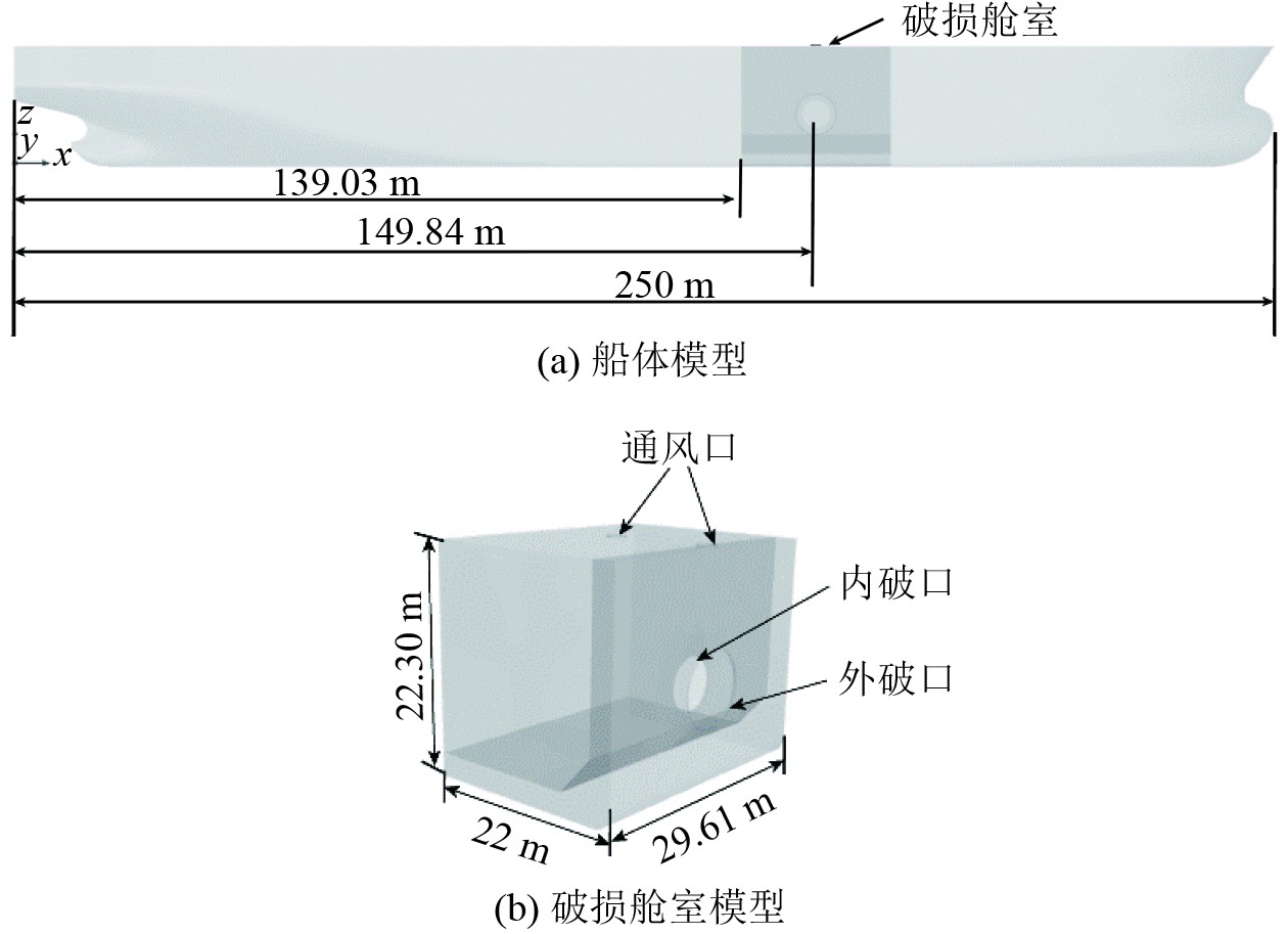其次建立舱室模型,如图4(b)所示。选择该船右舷第三货舱段的双壳舱室建立三维模型。其后舱壁距离艉垂线139.03 m,破口中心点距艉垂线149.84 m。该船设计的双壳宽度和双层底高均为2.40 m。舱室内外破口均设置为圆形,考虑外破口通常大于内破口的情况,取内破口半径为2.80 m,外破口半径为4 m,破口中心点距基线10.29 m、距舱室后舱壁10.81 m。考虑到空气压缩性对进水过程的影响,在主甲板上设置2个圆形通风口,通风口直径均为0.50 m。