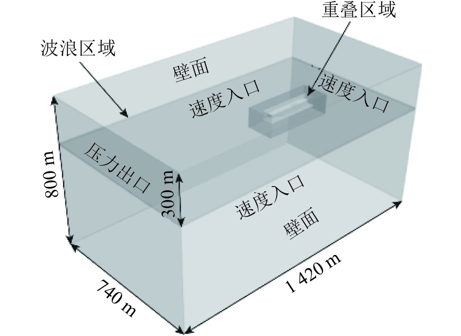2.2 计算域的建立与网格划分将上述船体和舱室模型导入到STAR-CCM+软件,并构建破损船舶水动力计算域,如图5所示,计算域尺寸为1420 m×740 m×800 m,其中水深为500 m,空气部分为300 m。计算域划分为背景区域、重叠区域和波浪区域。计算域边界条件设置如下:计算域前侧、顶部和底部边界为速度入口,后侧边界为压力出口,左右两侧边界为对称平面。舱室破口和甲板通风口设置为交界面,船体表面设置为光滑壁面。