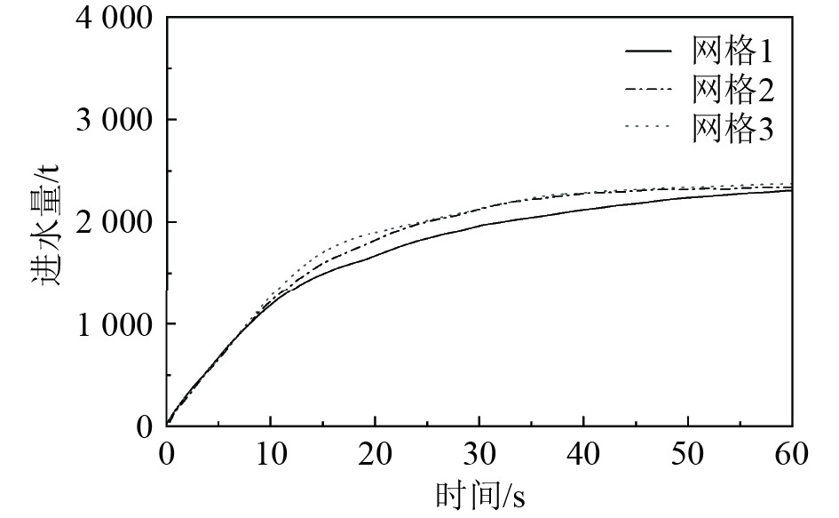 由图7可以看出,对于破损舱室的进水量变化,网格1与网格2、3的数值结果略有差别,网格2和网格3的数值模拟结果较为接近,表明321.12万网格已能满足计算精度的要求。可见网格尺寸过大对计算结果略有影响,但网格尺寸过小会使计算时间呈指数增长,对计算资源消耗过大,为兼顾计算精度和求解效率,选择网格2进行计算。