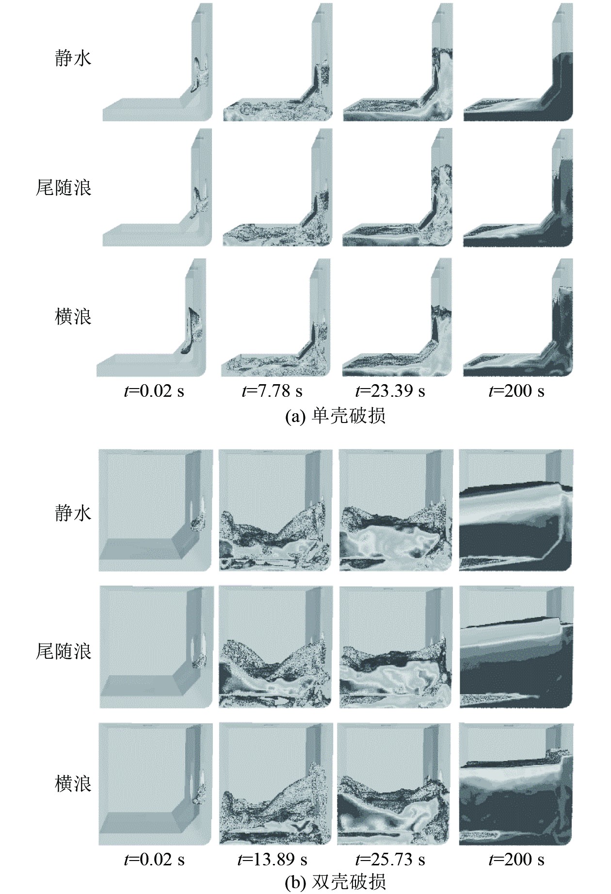3 模拟结果分析 3.1 不同海况下单、双壳破损进水过程对比分析图8(a)为单壳破损时不同海况下同一时刻的进水过程对比图,以横浪为例,破损船体在横浪的作用下,外界水体在t=0.02 s开始涌入压载水舱内,冲击到船体内壳后向四周扩散。在t=7.78 s时,外界水体不断流入压载水舱底部。在t=23.39 s时,压载水舱内自由液面进一步升高。在t=187.97 s时压载水舱内的进水量达到最大值