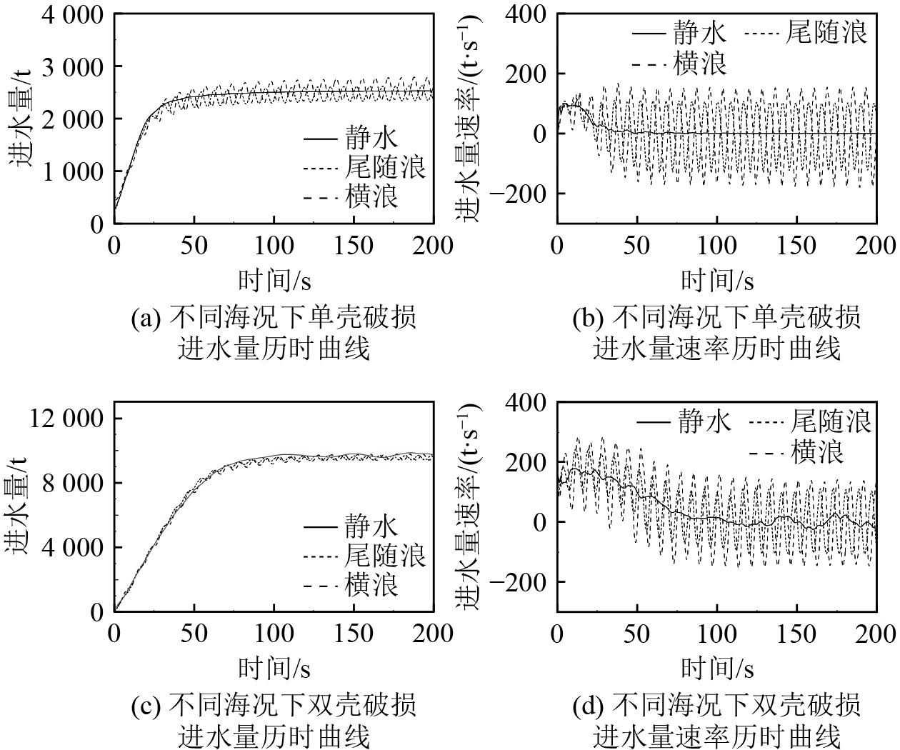 2) 单壳破损时,不同海况对进水量波动和进水量速率波动幅度的影响也较大,其中,横浪下的进水量最大波动幅度(437.23 t)是尾随浪下(301.34 t)的1.45倍,进水量速率最大波动幅度(333.70 t/s)是尾随浪下(239.46 t/s)的1.39倍。