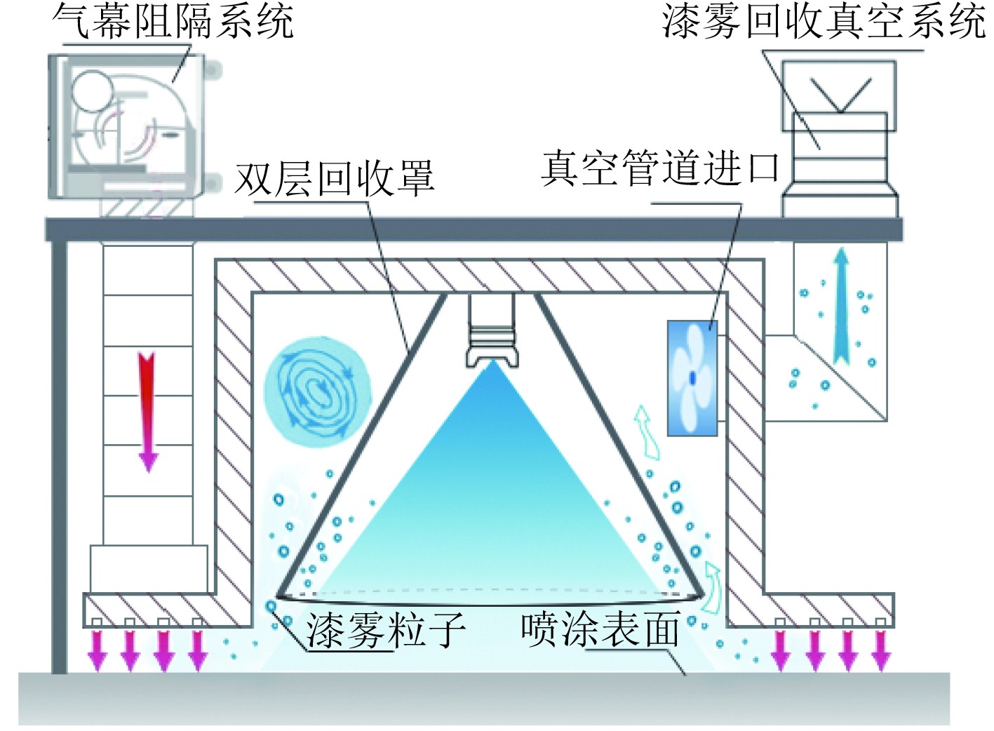 1 组合式回收漆雾粒子装置 1.1 组合式回收漆雾装置的原理图1为组合式回收漆雾装置。该装置主要包括:1)真空回收管道。喷枪作业产生漆雾,漆雾回收真空系统提供吸力回收漆雾粒子。2)双层回收隔离罩。内罩隔离漆雾回收与喷枪喷涂,避免干扰并提升回收能力。3)气幕阻隔系统。压缩机提供气体在双层回收罩和喷涂表面间形成气幕,阻隔漆雾扩散、增强作业空间密闭性,利于提高漆雾粒子回收效率。组合该装置,可快速、高效、低成本且可重复地回收漆雾粒子。