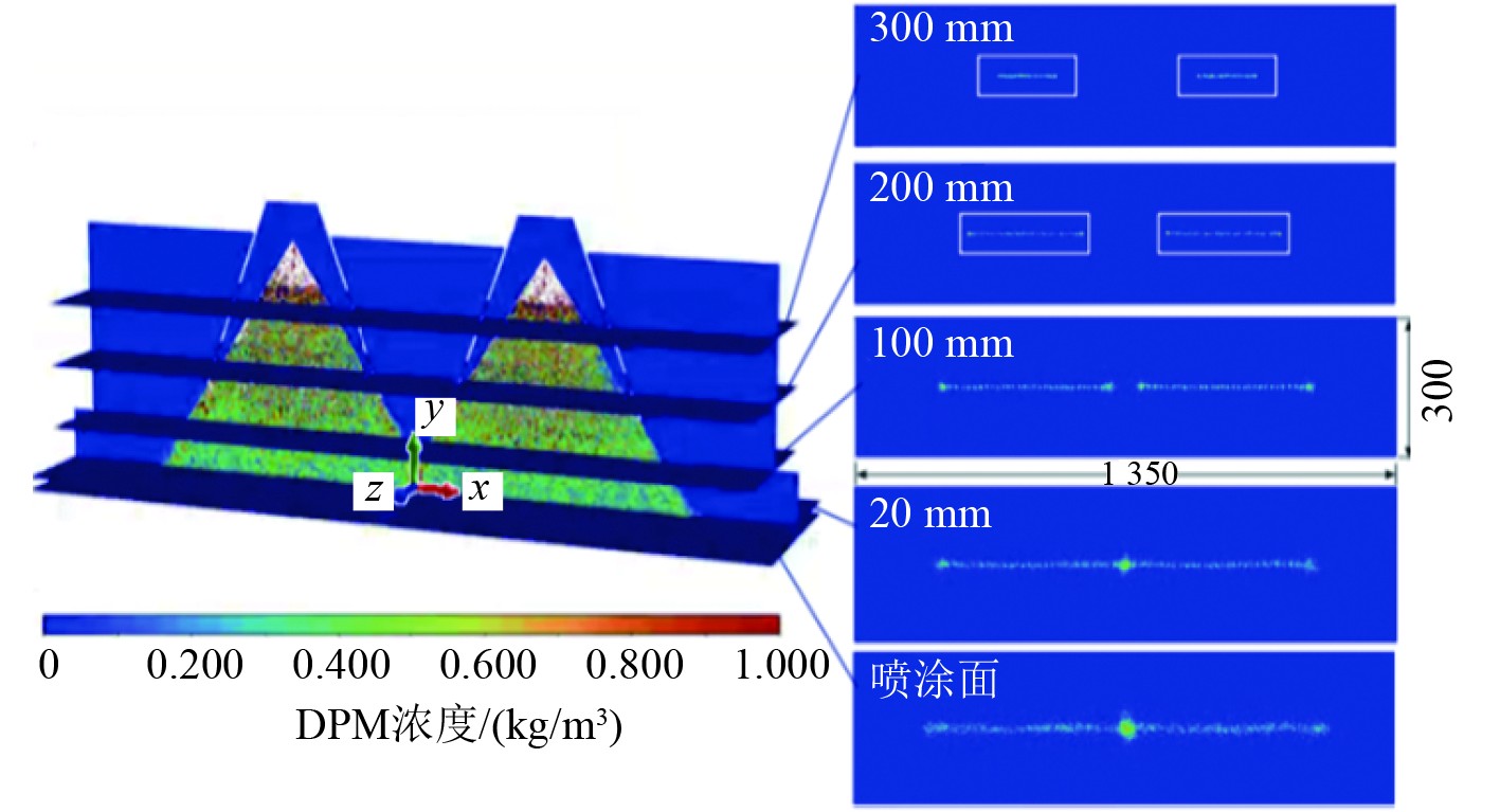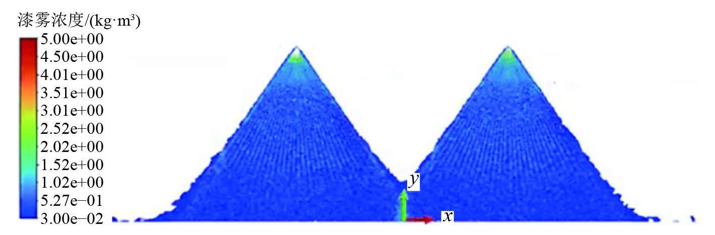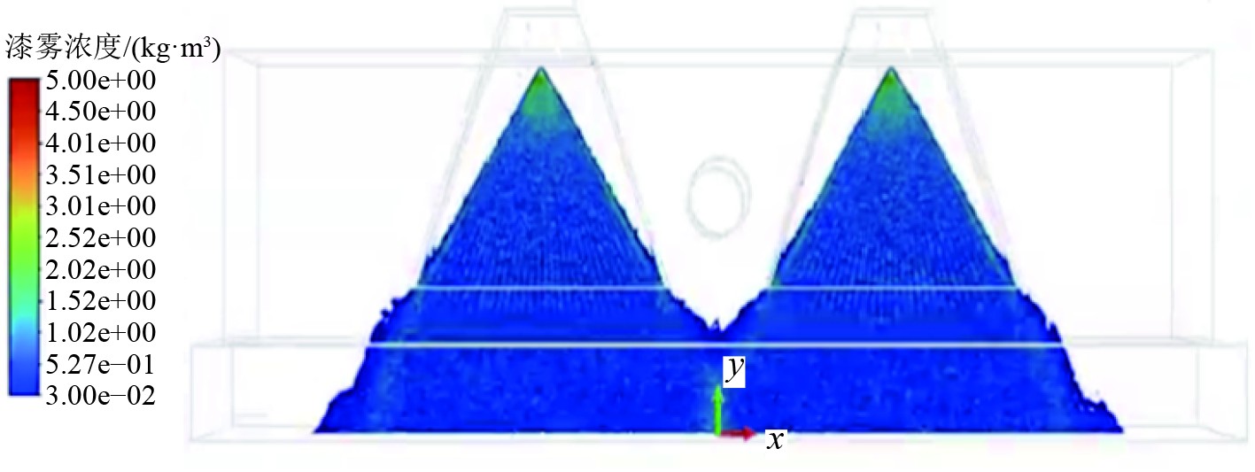 图 10 组合方案2的漆雾粒子流场浓度分布 Fig. 10 Concentration distribution of paint mist particle flow field in combination scheme 2 |