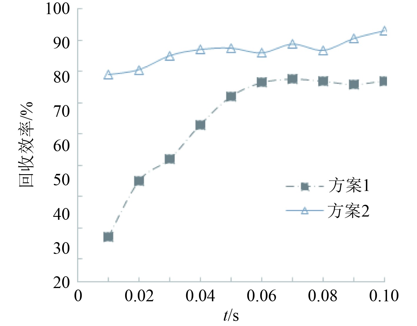 由图11可见,组合式回收装置初始工作时,仅真空抽气管运行,漆雾粒子回收效率低,随时间增加,0.1 s时达78.6%;气幕发生器与风机同时工作时,始终保持高回收效率,最高达93.5%。对比2种方案,结合图6和图9,回收罩边界射流风幕有效隔绝漆雾粒子,提升密封性,真空管道抽吸产生负压,缩短粒子飞行行程,使其不聚集于边界,迅速被捕获,回收效率更高。