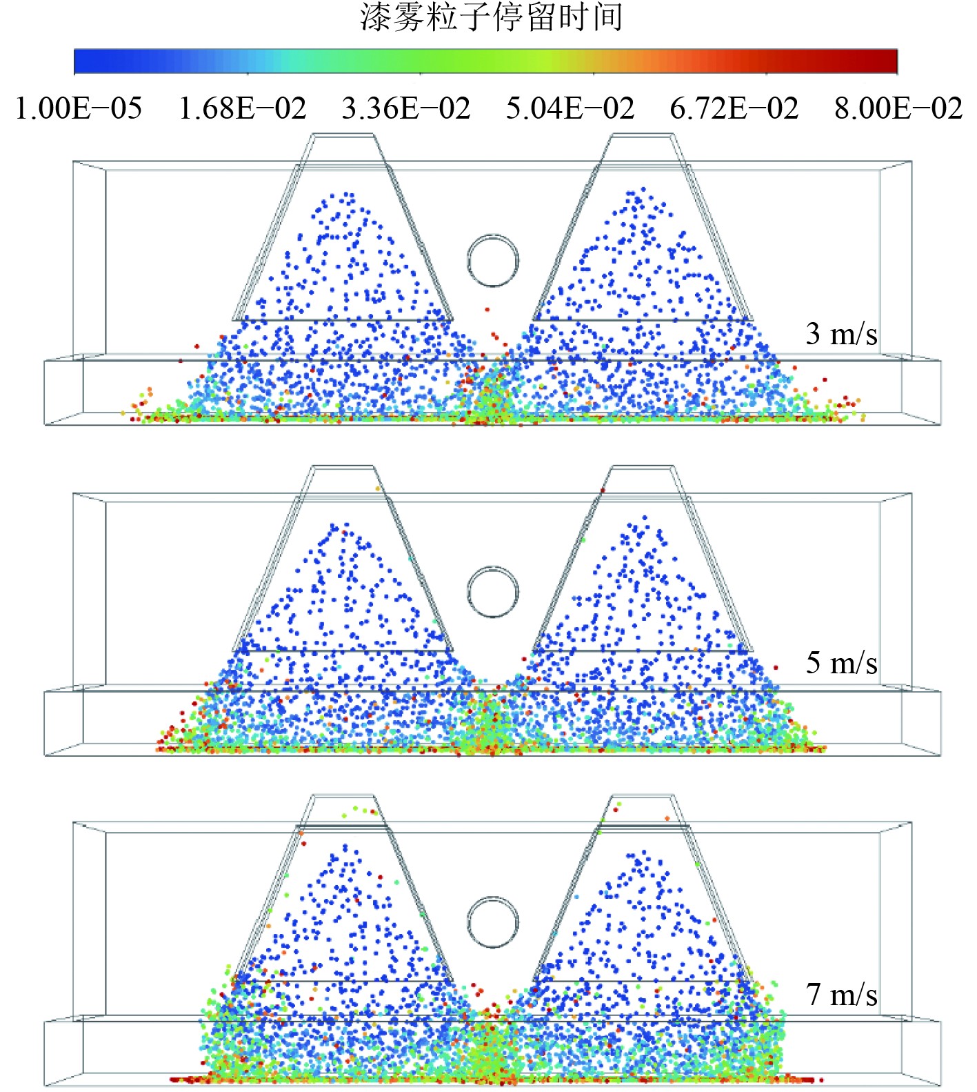 6.2 气幕气流速度对漆雾粒子回收的影响为探究气幕气流速度对双喷嘴漆雾粒子回收过程及效率的影响,分别将气幕气流速度设为3、7 m/s,并与5 m/s 的工况对比。图12展示了各工况下漆雾粒子在流场中的停留时间分布。