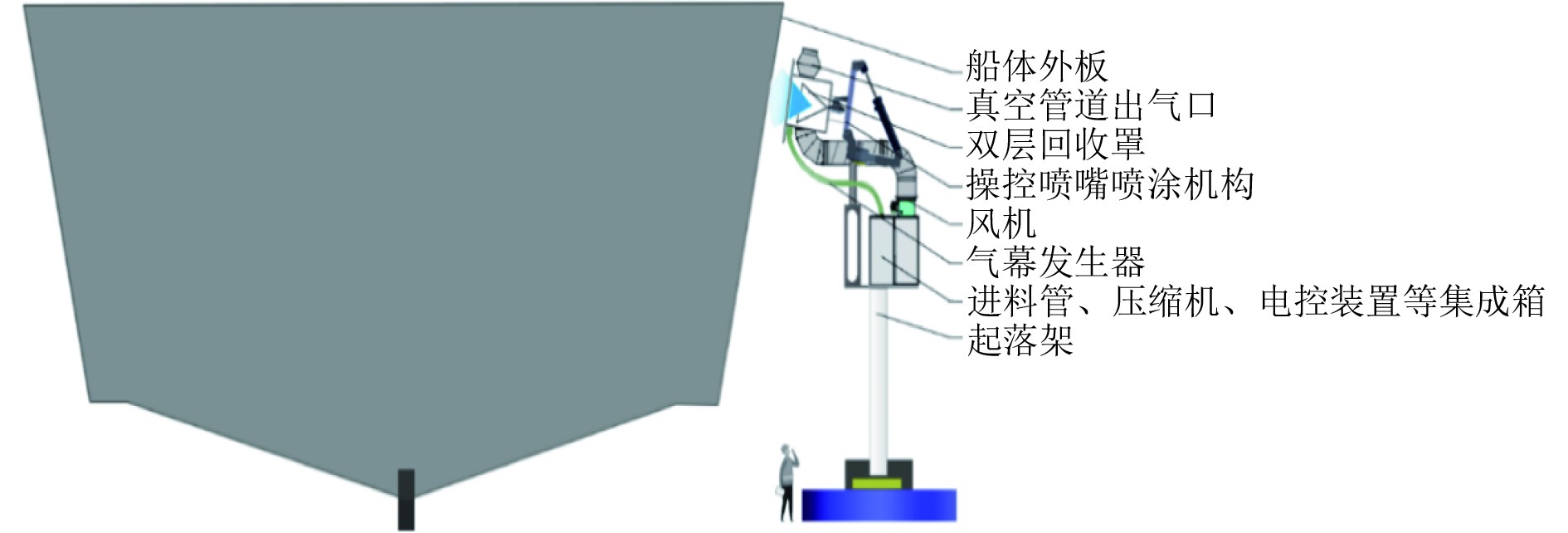 目前,针对船体外板的漆雾回收系统的研究较少。大部分研究集中在漆雾回收的后期处理,或在喷漆房的空气净化和漆雾分离。刘晓宏等[7]探讨了气液双流体喷嘴雾化特性,得到了喷嘴射流的流场特性和雾化特性。谢颖瑶[8]研究了喷漆废气治理技术方案,指出漆雾干式净化作为最重要的净化法,应用之前需要首先通过风机的负压抽吸作用收集漆雾。这种方法对结构要求低,损耗小,易于实现。通过合理实施漆雾回收装置方案,能较好解决污染严重、降低后续 VOCs 再处理成本等问题[9 − 11]。但喷涂作业中防扩散漆雾装置研究极少[12 − 13],大量漆雾扩散会危害工人健康与环境。基于此,本研究提出一种组合式回收漆雾装置捕获漆雾颗粒。图2为搭载该装置的船舶外板喷漆系统图,主要由双层回收罩、真空回收管道、气幕发生器和集成箱等组成,需对其漆雾回收效率分析以验证其科学性与先进性。