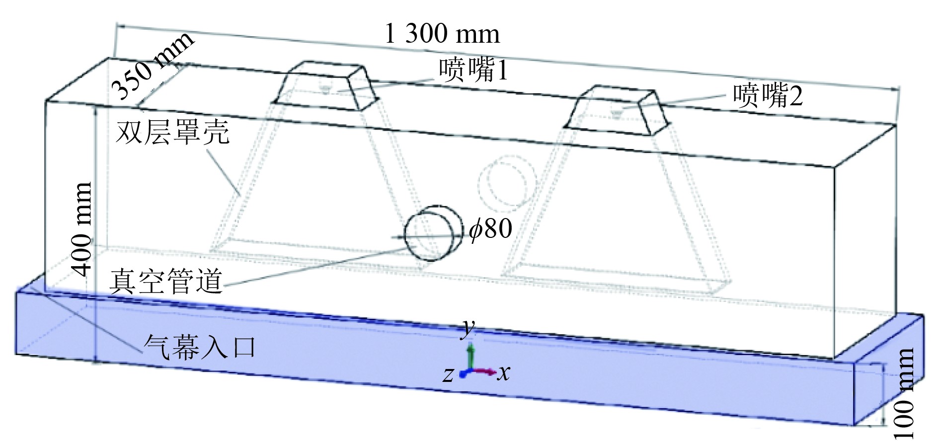 3 计算模型 3.1 模型与网格为了获得较大的喷涂效率,选取了双喷头喷涂船体外板的作业情况。喷嘴选用美国Graco牌的涂料喷枪,其基本参数如表1所示。喷嘴距船体外板400 mm,建立长1.3 m、宽0.3 m、高0.4m的矩形回收罩模型,双层回收罩开口面距船体外板100 mm。结合喷嘴参数与喷涂机构[18]设计真空管道和气幕,确定CFD 模型如图4所示。用Fluent2022 R2软件划分网格并分析模拟[19 − 20]。油漆射流从喷嘴1、喷嘴2喷出,漆雾被真空管道回收,气幕阻隔粒子飞溅。模型采用0.5 mm四面体网格,经无关性验证,网格数