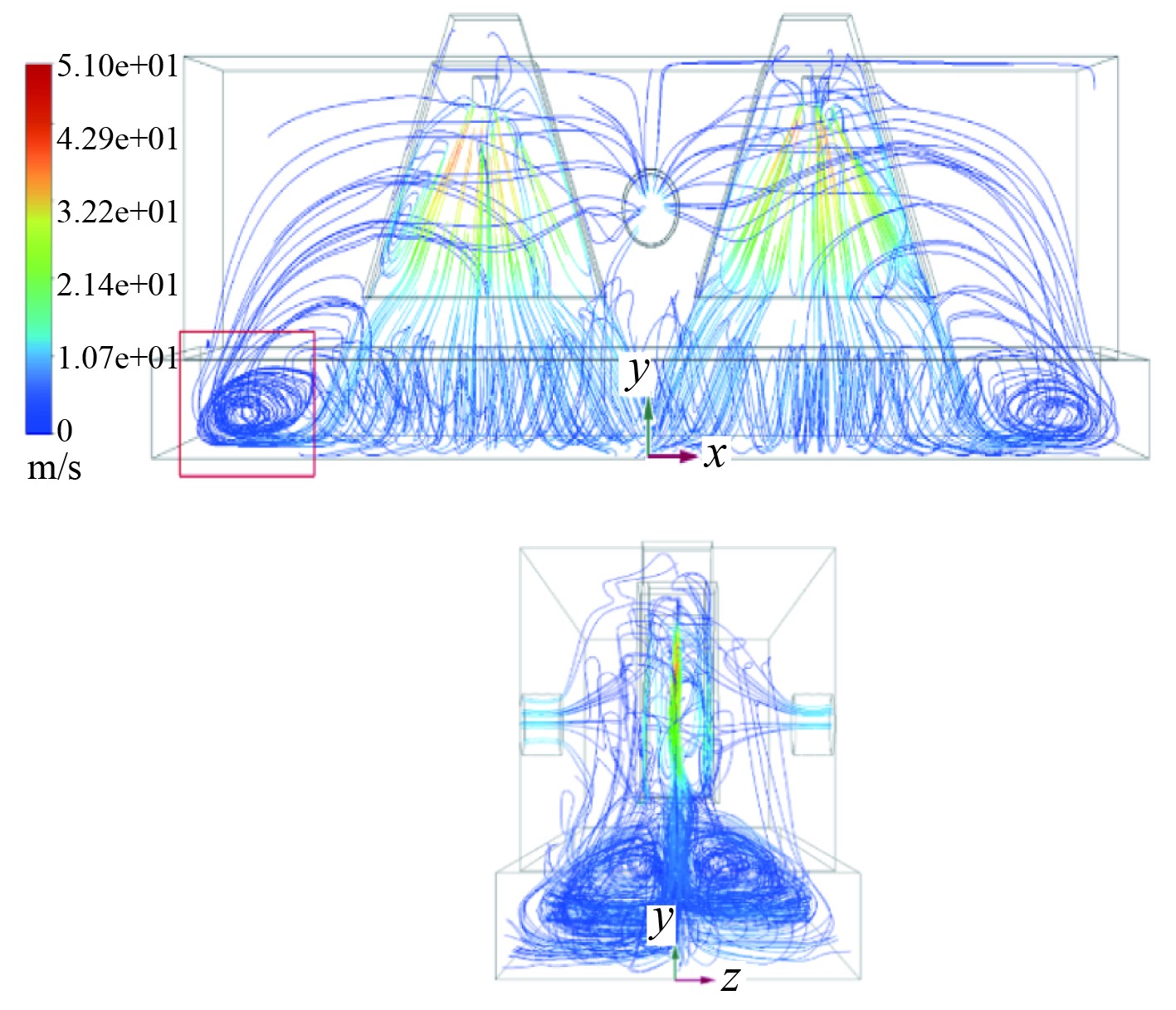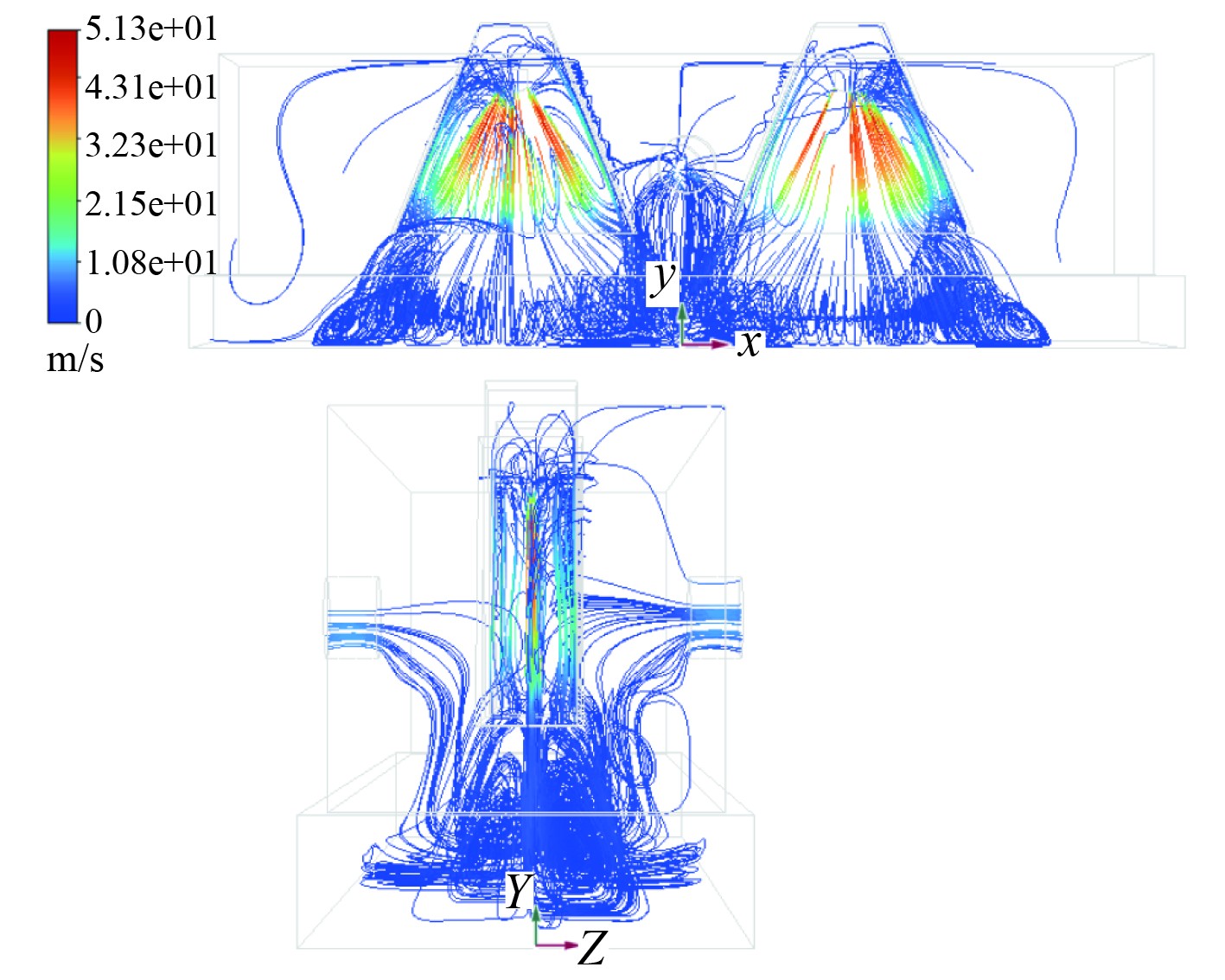 图 6 漆雾粒子流场迹线分布 Fig. 6 shows the trajectory distribution of paint mist particle flow field |