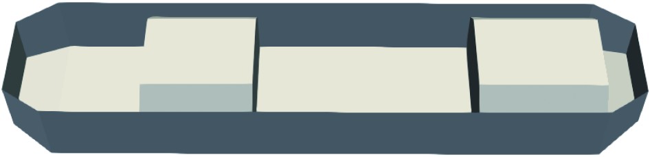 1 数值方法和模型设置 1.1 模型设置采用简化的LNG船进行耐波性数值模拟,船体内部设有2个棱形液舱,LNG船体三维几何模型如图1所示。采用1/100的缩尺模型进行数值模拟,船体模型的主要尺度见表1,更详细的几何参数可见参考文献[15]。本文中不同装载条件下,船体结构的重量和转动惯量均保持不变。吃水随装载率的变化而变化,更加合理,符合实际情况。在耐波性计算中,释放船体的垂荡、横摇和纵摇3个运动自由度,限制横荡、纵荡和艏摇3个运动自由度。