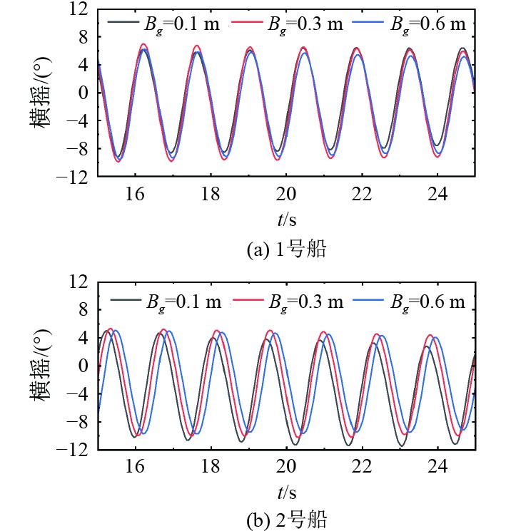 图10为并靠船的垂荡运动在并靠距离Bg=0.1 m、Bg=0.3 m和Bg=0.6 m的变化时历曲线对比,由图可知迎浪1号船的垂荡运动受另一侧船只的影响不大,而两船并排时的船间距对背浪侧2号船的影响明显。图11为船并靠时的横摇运动在并靠距离Bg=0.1 m、Bg=0.3 m和Bg=0.6 m的变化时历曲线对比。可知,两船间距的改变对背浪侧的船只运动影响较大,而迎浪侧的船舶运动对船间距的改变不敏感。