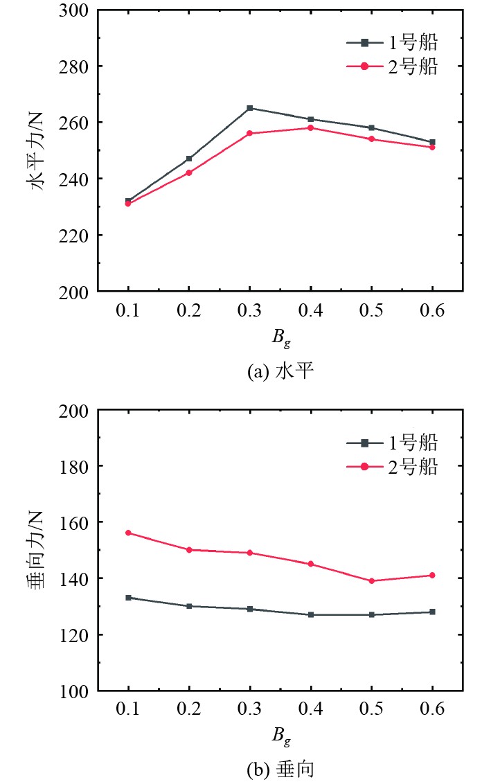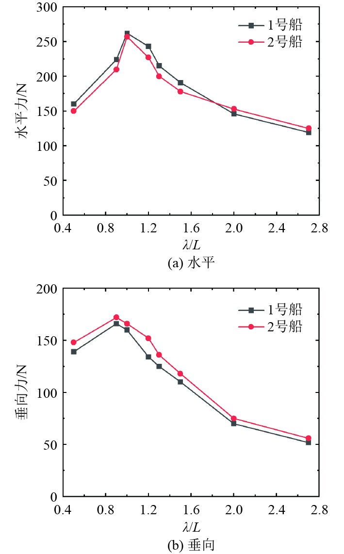 图 7 并靠船舶的受力幅值变化 Fig. 7 Variation of stress amplitude of two ships |