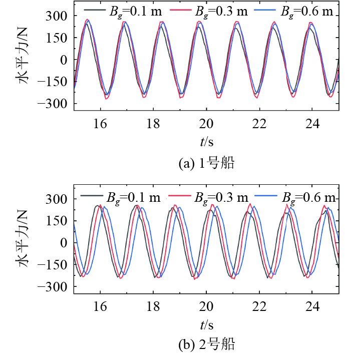 图12为不同船间距下的并靠船舶受力幅值变化曲线,图12(a)为并靠船舶水平受力变化,船的水平方向受力先增大后减小,在Bg=0.3 m处达到最值,在远离共振点处,并靠船舶的水平受力都很接近。图12(b)为并靠船舶垂直方向受力变化,船体的垂向力随着船间距的增大而减小,1号船的最大垂向受力与最小垂向受力仅差4.7%,2号船的最大垂向受力与最小垂向受力差12.2%,这表明两船并排水动力时,迎浪侧的船垂向受力受船间距影响不大,背浪侧的船垂向受力会随着距离的减小而增大。图13为并靠船舶水平受力在不同间距下的时历曲线对比,图14为并靠船舶垂向受力在不同间距下的时历曲线对比。由图可知船间距的改变对1号船垂向力的作用不明显,这说明船并排水动力时,船间距不是影响迎浪侧的船舶的垂向力大小的主要因素,而2号船的垂向力随间距的增大缓慢减少。