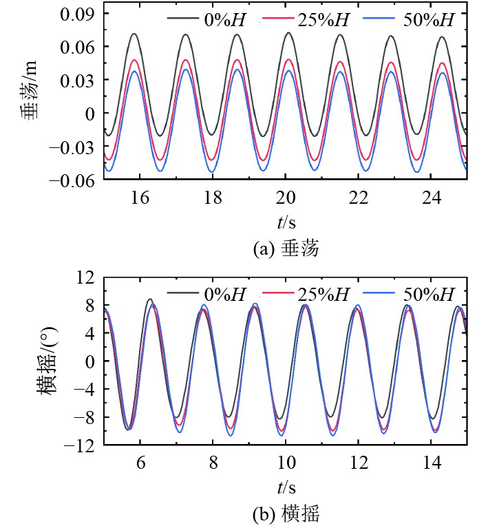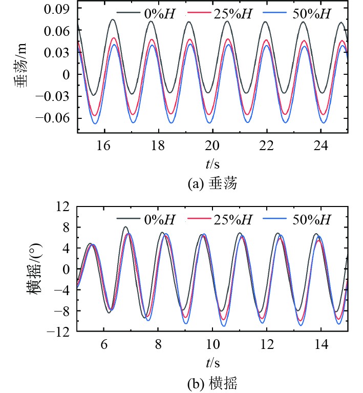 为了研究载液率对并靠船舶运动的影响,以波长船长比λ/L=1、波高h=0.1 m、并靠船舶间距Bg=0.3 m,横浪工况下,选取了并靠船舶载液率分别为0%H、25%H、50%H时的工况进行了模拟。图15和图16为不同载液率下的船舶的垂荡和横摇时历曲线对比。可知,随着载液质量的增加,船体吃水增加,垂荡中心改变明显,0、25%H、50%H装载率下的船体的垂荡运动幅度变化逐渐减少。另一方面,船的横摇中心也随着装载量而变化,载液率越大,横摇幅度越大,50%H的载液率1号船比0%H的横摇角增加了18.3%。结果表明由于载液率的提高,液舱内流体质量增加,液舱内的流体改变了船体横摇方向转动惯量,耦合效应加剧了船舶横摇运动幅度,随着载液率增加,液舱晃荡耦合效应对船舶横摇运动的加剧作用越显著。