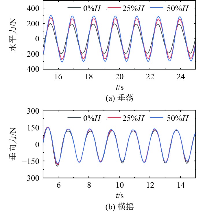 对0%H、25%H、50%H等3种不同装载率的船体受力进行对比分析。表3为不同装载率的船体受力幅值数据对比,随着载液率的增加,船体的受力也增大。图17和图18为船体水平力和垂向力随装载率变化的时历对比曲线,可知载液率对船体的水平方向受力有明显影响,对垂向受力的影响甚微。