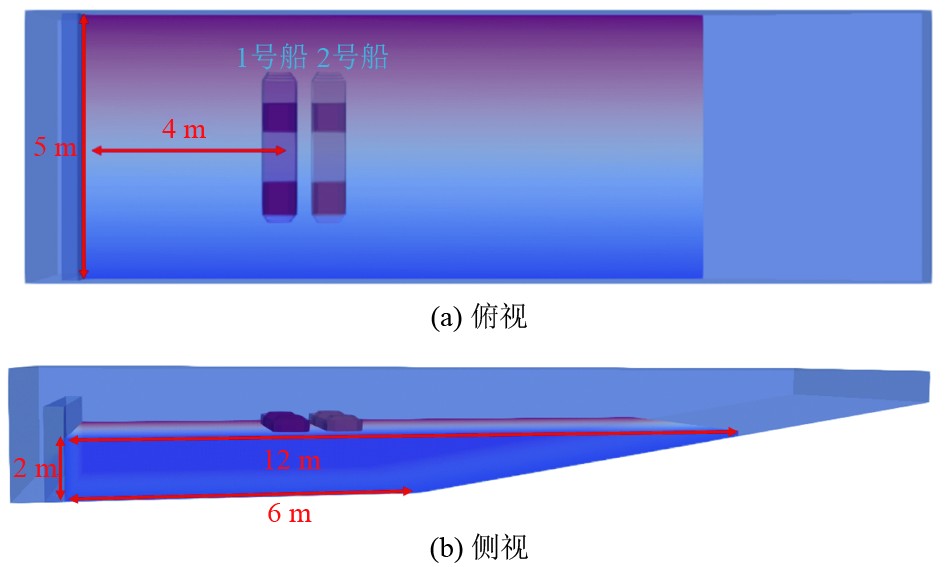 最早Ohkus[1]、Kodan[2]等许多研究者对于多浮体系统水动力干扰问题的研究仅限于二维切片理论的计算。但随着计算机的高速发展,基于格林函数的三维势流理论方法快速的应用到多浮体系统水动力的计算中。Wang等[3]建立了一个利用具有瞬态格林函数的三维(3D)势流理论来预测两船并靠系统的水动力扰动和运动响应的数学模型。Joao等[4]对FPSO系统和在迎浪中并排漂浮的穿梭油轮的波诱导运动进行了数值研究。Huang等[5]利用三维势流理论研究了非平行并排配置下单壳浮体和FPSO之间的被动伸缩通道的响应。波浪载荷与多浮体之间的耦合作用是分析多浮体水动力系统响应的关键,一般用粘性流理论和势流理论,势流理论方法计算效率高,适用于初步设计和参数分析,但难以考虑粘性效应和强非线性现象。与势流理论相比,粘性理论有较好的计算精度。因此,粘性流方法依旧是研究多浮体系统水动力干扰的重要方法。Kouki等[6]使用DualSPHysics模拟恶劣海况下的船舶六自由度运动,通过与物理模型实验的对比,系统地研究了SPH方法在浮体运动方面的预测精度。丁绱等[7]采用基于SPH的DualSPHysics开源软件模拟了方箱型浮体运动和液舱晃荡的耦合问题,并分析了二维与三维模拟结果的差异性。Siti等[8]使用DualSPHysics模拟刚性浮式结构物在规则波下的运动响应,并对不同的波浪生成提供了参数建议。Van der Valk等[9]采用水池试验模拟FLNG旁靠作业,分析发现在极端海况下两船之间的连接需采用全动力定位系统。Hong等[10]通过模型试验分析了不同浪向下LNG船旁靠FLNG时受到的波浪力和水动力变化的影响因素。Zhu等[11]研究了多个并排浮体之间的间隙共振对水动力作用的影响,发现间距的特性对多体辐射的共振频率和振幅有很大影响。He等[12]对一浮体运动而另一浮体固定工况中的高次谐振进行了研究。Jian等[13]采用基于势流理论的数值模型,研究了一种铰接式模块化浮式多体结构对模块数量、模块布置、入射波角度的水动力敏感性。Li等[14]采用边界元法研究由波浪引起的两艘自由漂浮的货船之间的间隙共振现象。