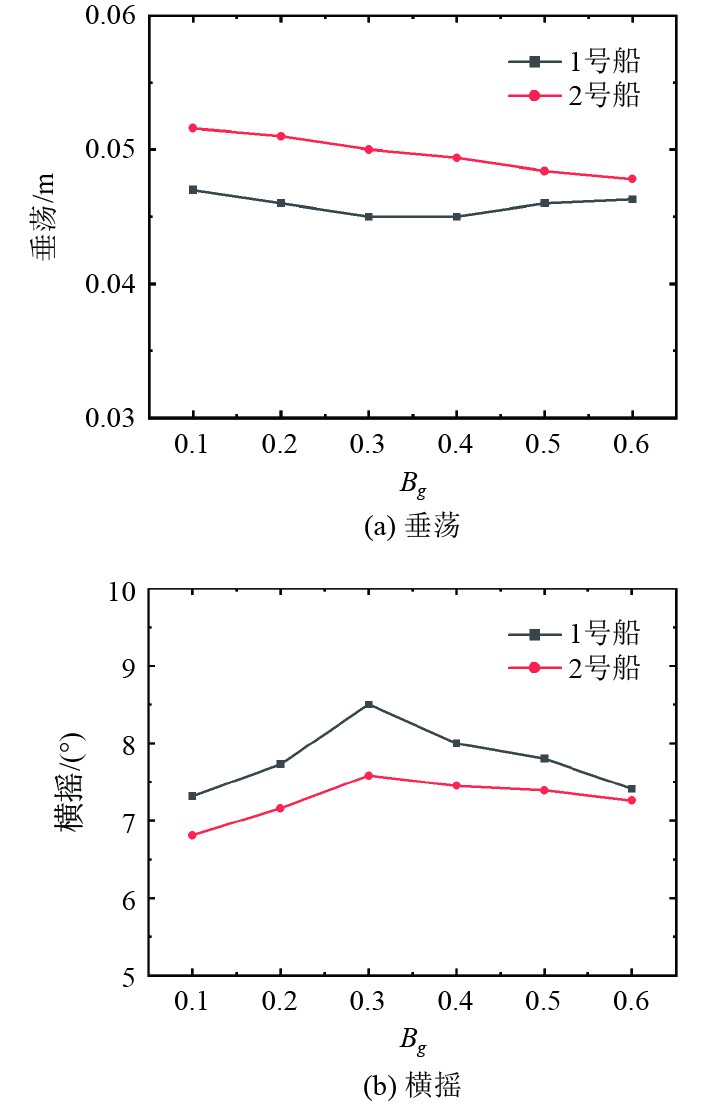 为了研究两船并靠时,间距对两船之间的影响,船舶在横浪状态中,以入射波周期T=1.41 s、波高h=0.1 m的波浪下,选取了0.1、0.2、0.3、0.4、0.5、0.6 m的船间距进行模拟。图9为两船并靠时,船体的运动幅值随并靠船舶间距变化的曲线,图9(a)为两船的垂荡运动变化曲线,并靠船舶的垂荡运动幅值随间隙减小而增大,1号船在不同间距下的最大垂荡幅值和最小相差5%,2号船在不同间距下的最大垂荡幅值和最小相差12.8%,说明两船之间的距离对并靠船体的垂荡运动影响差异不明显,而且随着船间距的增大,两船的垂荡幅值趋于一致。图9(b)为两船的横摇运动变化曲线,两船的横摇运动幅值随着距离的增大呈现先增大后减小的趋势,都在Bg=0.3 m时达到最值,可知两船的横摇运动不是距离越小越大,而是在某一特定距离下达到峰值,实际工程时应避免这一距离。因为遮蔽效应,1号船的横摇运动始终大于2号船,当船并排时的间距较大时,运动幅度接近单船状态,间距适中时,共振效应显著,运动幅度增大。较宽的窄缝下水体共振造成的浮体运动幅度要大于较窄的窄缝情况下,因为较宽的窄缝对应的共振时水体的抬高要大,即双浮体附近尤其是窄缝附近的水体运动更剧烈。