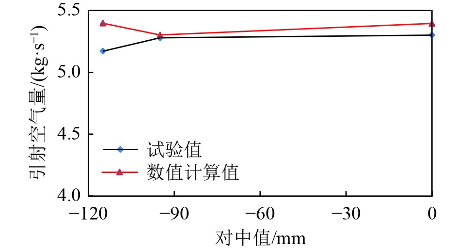 对于3种对中度模型其引射空气流量试验值与数值计算值基本一致;ΔP2、ΔP1在变化趋势上,试验值与数值计算值趋势基本一致,其排气阻力的数值上差异可能是由于对中度偏移导致在排气蜗壳出口处局部空间小网格分配不够所导致的。