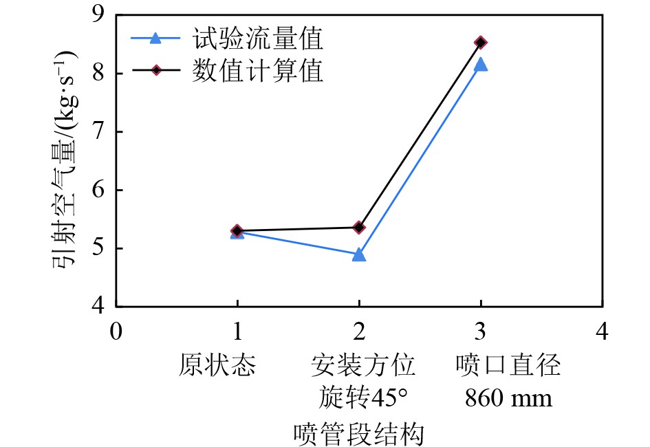 根据试验结果,调整喷管段安装角度对排气系统和喷管段阻力损失影响不大,引射空气流量和排气阻力阻力损失基本没有变化;增大喷管段出口直径,由于排气阻力降低、流速增大,该措施可提高引射空气流量、降低排气阻力阻力损失,但该措施在使用过程,需考虑排气系统出口温度的要求。对于3种模型,引射空气流量试验值与数值计算值基本一致;ΔP2、ΔP1在变化趋势上,试验值与数值计算值趋势基本一致。