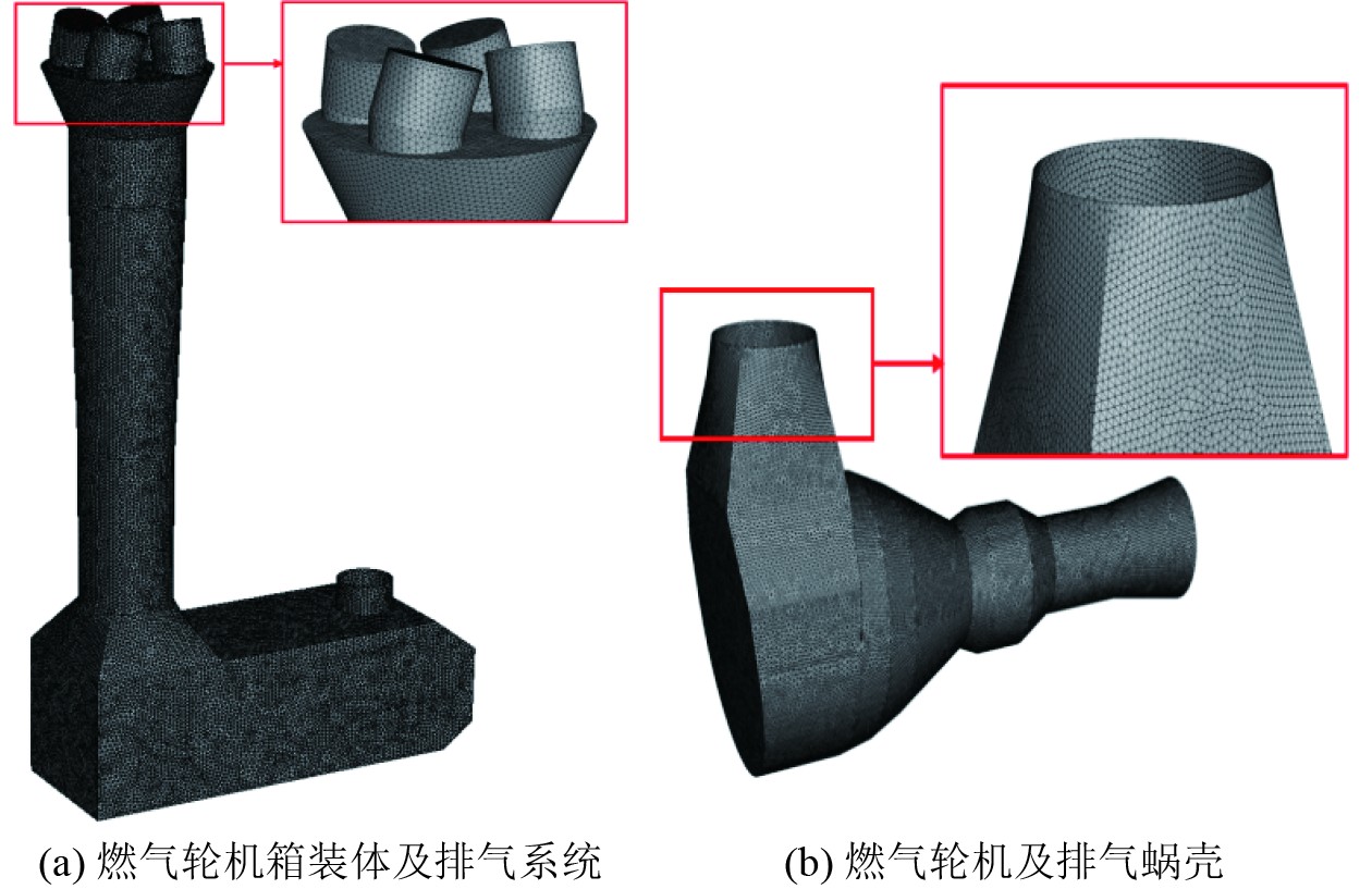2 排气引射及排气系统数值计算 2.1 建模及计算方法为进行燃气轮机排气引射冷却空气量及排气系统阻力的准确仿真计算,按照燃气轮机本体、箱装体、排气管、喷管段等实际尺寸建立模型。