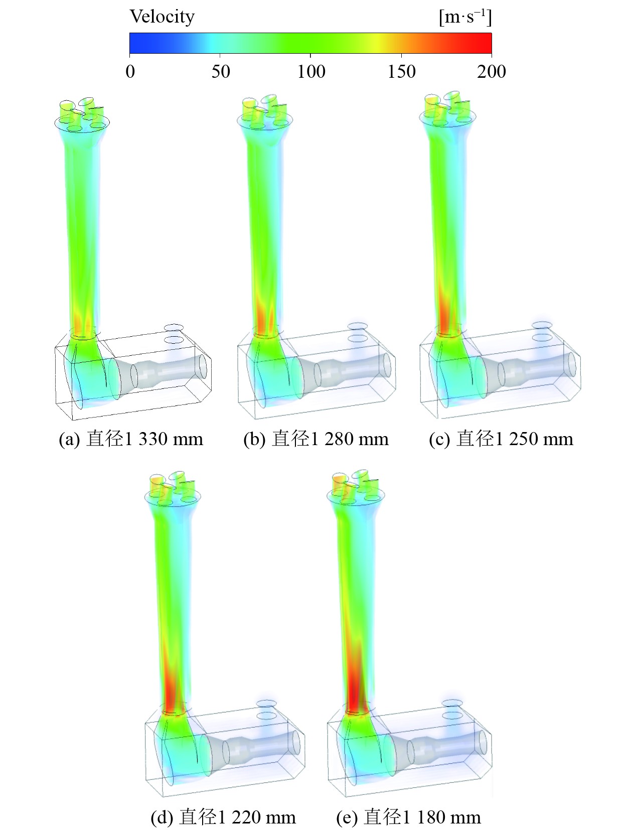 2.2 缩小排气蜗壳喷口仿真计算为增大箱装体排气引射空气冷却量,在原排气蜗壳出口的基础上进行缩小,来计算箱装体排气引射空气量及排气系统的阻力。排气蜗壳喷口计算分为5组,排气蜗壳出口直径分别为1330(原尺寸)、1280、1250、1220、1180 mm。通过数值计算,5种模型的气流速度场结果如图4所示,空气引射空气量及排气管压力损失计算结果如表2所示。可见燃气轮机在额定工况下,随着排气蜗壳出口面积的减少,箱装体引射空气量增加,排气蜗壳出口(PY1处)排烟压力会增大,同时排气管压力损失ΔP2会增大。由于箱装体排气引射空气量的增大及排烟总压的增大,共同导致了Y2处总压大幅增大。