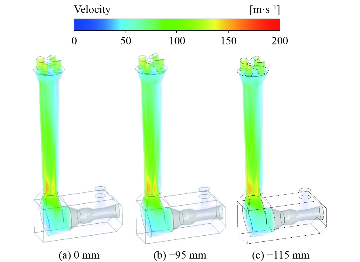 排气蜗壳出口与排气管进口,中心线偏差为对中度。该排气系统原始状态下排气管进口与排气蜗壳出口存在95 mm的对中度偏差,为验证对中度变化对排气引射系统产生的影响,建立了刚好对中(0 mm)和对中偏差115 mm的模型进行模拟。通过数值计算,3种模型的气流速度场结果如图5所示,空气引射空气量及排气管压力损失计算结果如表3进口所示。通过计算结果,可知排气蜗壳出口与排气管对中度的变化对箱装体排气引射空气量及排气系统阻力影响较小。