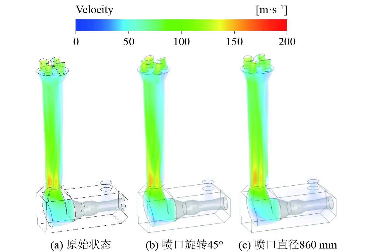 根据现有喷管段的状态,进行原状态(喷口直径为800 mm)、喷口旋转45°、喷口直径扩大为860 mm,共计3个模型进行数值模拟计算。