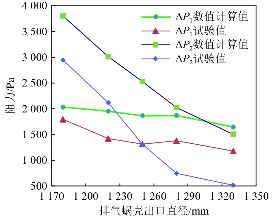 4 结 语通过缩小排气蜗壳喷口、变化排气蜗壳出口与排气管对中情况、变化喷管段结构3个方面的数值计算及试验验证得到以下结果: