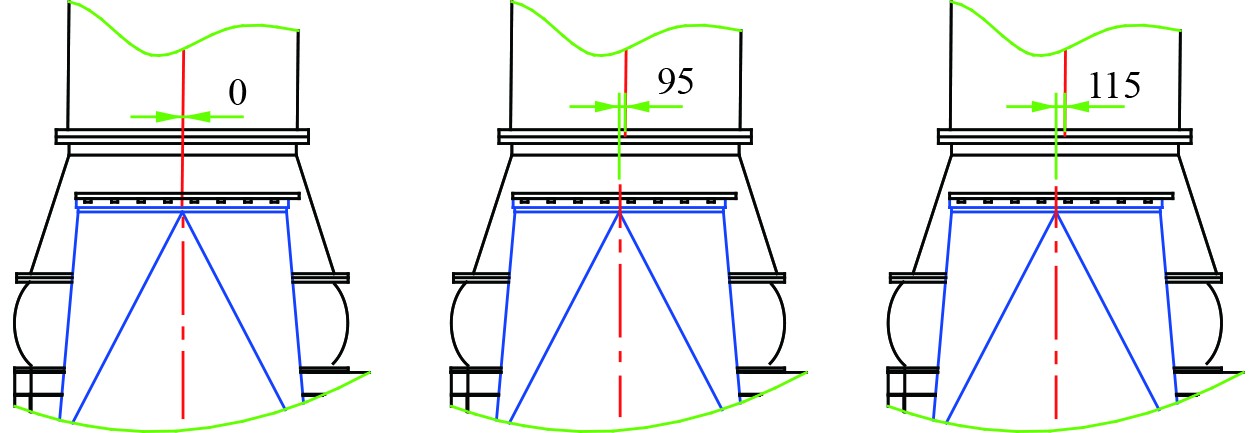 根据上述2.3节,排气蜗壳出口与排气管进口对中情况包含3种试验方案,如图9所示,分别为0、−95(原状态)、−115 mm,已验证对中度对引射及排系统阻力的影响。