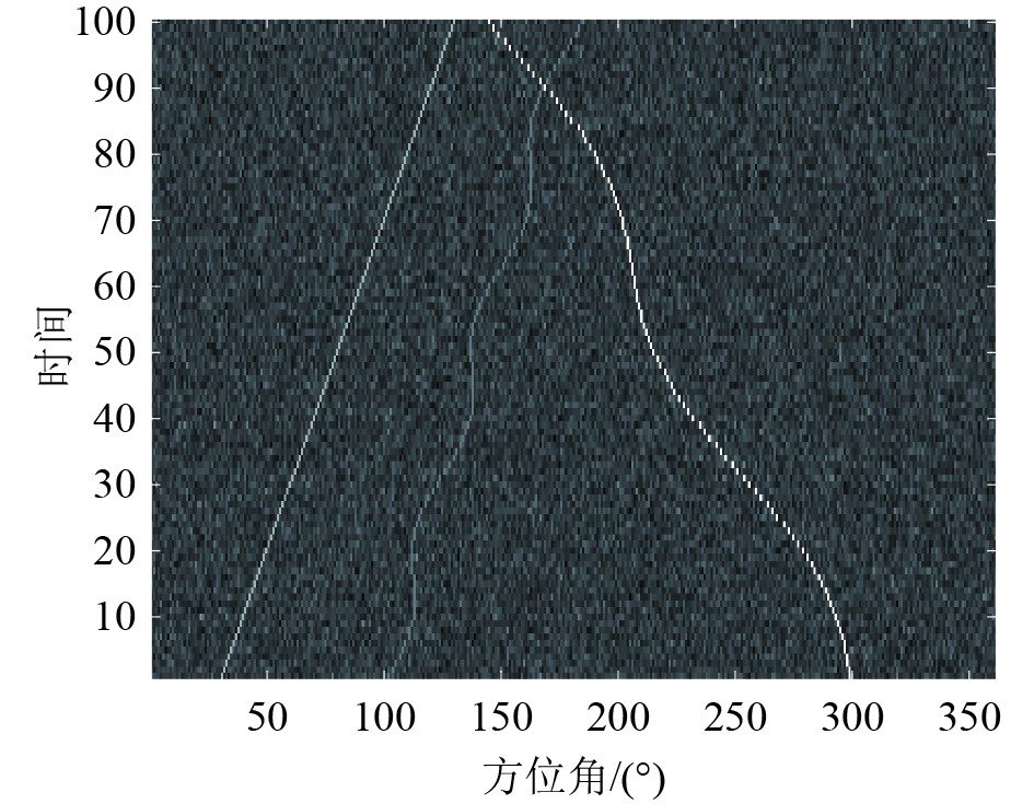 方位历程图应用于被动声呐的阵列信号处理问题中,一般作为检测的结果。其含义是对不同时刻下,每个波束的输出能量进行记录,并显示出来。对于方位历程图中的可疑轨迹进行提取,对于后续的识别与跟踪具有很重要的价值[1-2]。可以为目标的存在性、方位角度、运动状态甚至类别等信息的判定提供重要的参考。