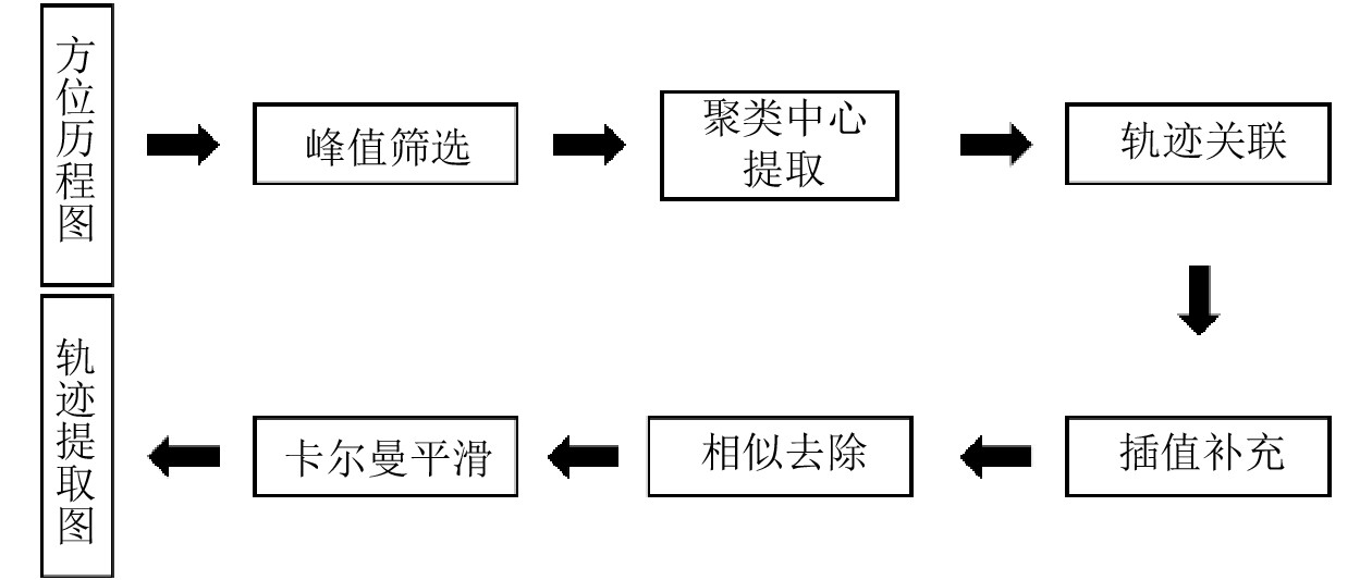 2 三维信息融合的目标轨迹提取算法本文同时利用时间、角度和功率3个维度的信息提出了一种三维信息融合的目标轨迹提取算法。该算法主要分为峰值筛选、聚类中心提取、轨迹关联、插值补充、相似去除和卡尔曼平滑等6个步骤。该算法的核心主要包括峰值筛选与轨迹关联。峰值筛选利用了自适应背景均衡技术,设置保护窗长自适应的筛选峰值;轨迹关联利用了三维信息融合判别技术,通知结合三个维度的信息来判定轨迹的存在、连续与消失。算法的流程如图2所示。