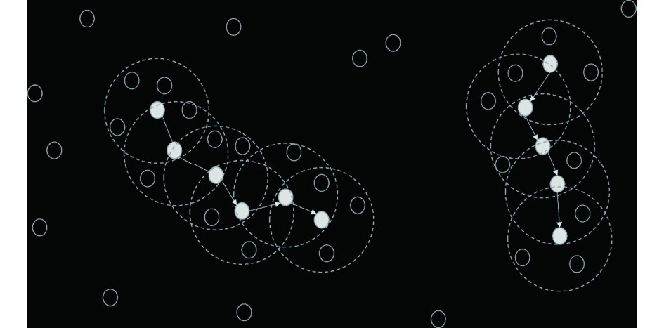 可以看出,聚类过程可以将一片区域的峰值点聚类起来,不仅降低量测点数目,还可以使轨迹清晰。这采用DBSCAN算法通过寻找密度相连点的最大集合来划分聚类。算法的具体步骤如下: