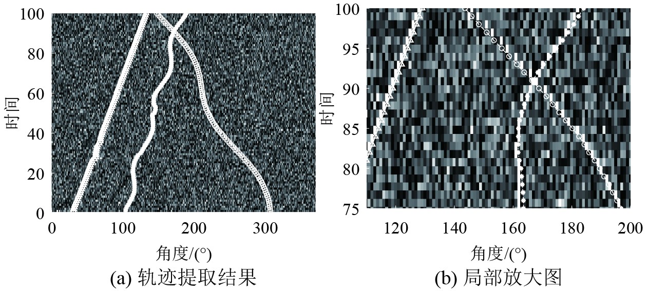 可以看出,在弱目标多目标轨迹提取中,该算法的有效性得到了较好的验证,有效提取了弱目标轨迹及包括交叉轨迹在内的多目标轨迹,并进行了有效的航迹关联。这里值得注意的是,预设信息