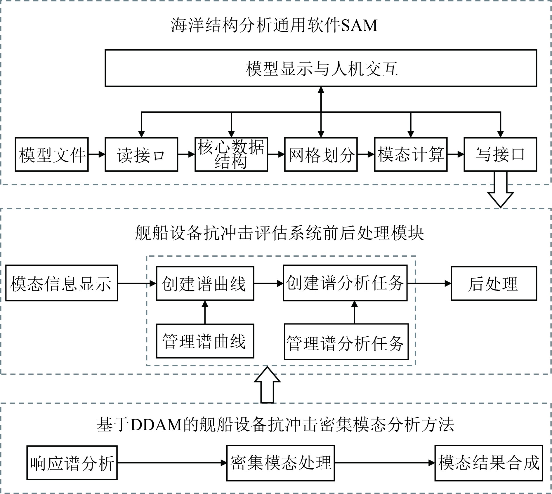 2 船舶设备抗冲击评估系统模块实现本节分别对船舶设备抗冲击评估系统依托的基础平台SAM、系统专用的前后处理模块和核心计算模块进行介绍。