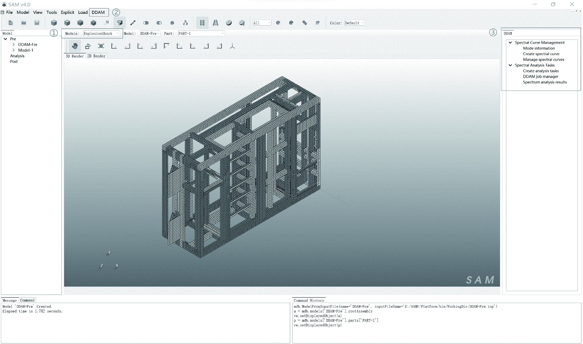 SAM v2024版本提供了一套开发环境,供开发人员访问核心数据及调用各种接口,开发人员可以使用cmake工具管理工程,根据cmakelist快速构建工程和配置开发环境。设备抗冲击评估系统的前后处理模块和核心计算模块通过以上C++二次开发接口集成至SAM软件,集成后的评估系统按照图2中标记的序号进行打开,将Module选择为ExplosionShock后点击主菜单栏上的DDAM按钮,即可弹出右侧的界面树进行前后处理和求解计算。
