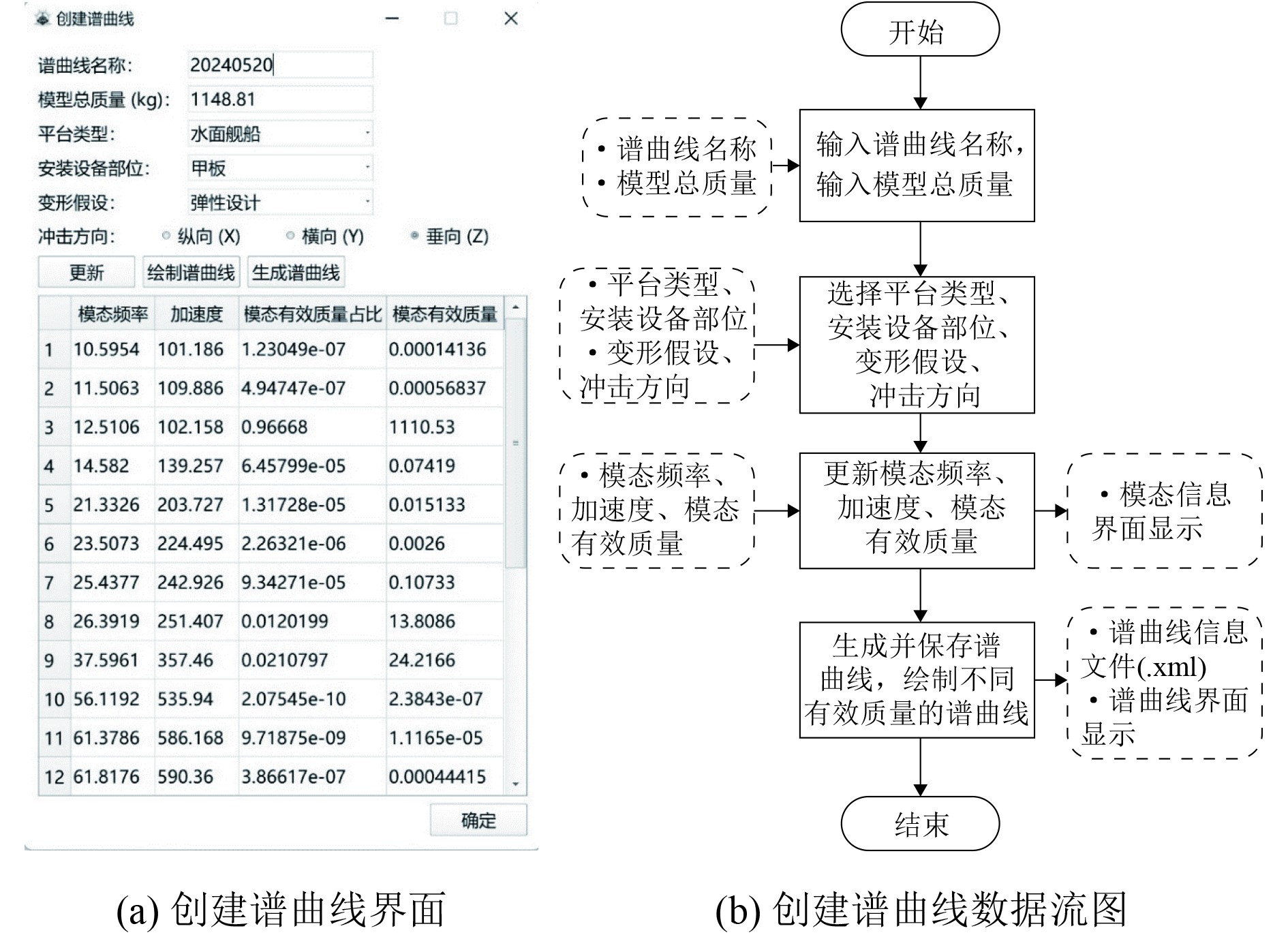 2)创建谱曲线。响应谱分析法建立在响应谱曲线的基础之上,因此该子模块作为DDAM计算的前置步骤,用于自定义并生成DDAM所需要的输入谱,对应的界面和数据流图如图3所示,数据流图中左侧的虚线框为子模块的输入,右侧虚线框为子模块的输出。首先输入谱曲线名称、模型总质量,然后选择平台类型、安装设备部位、变形假设以及冲击方向,进而根据输入的参数更新模态频率、加速度、模态有效质量并进行界面显示,最后生成、保存并绘制不同有效质量的谱曲线。