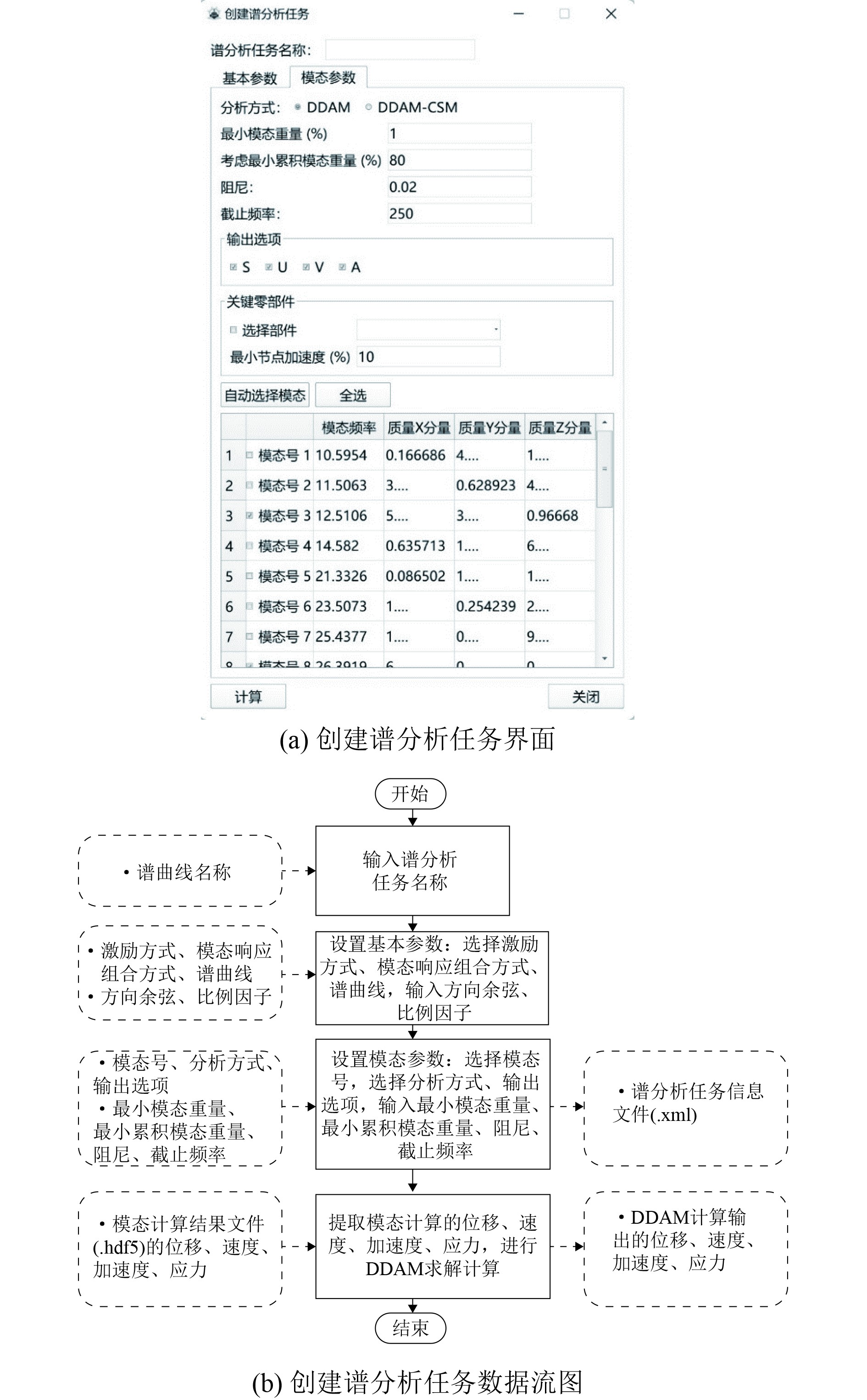 4)创建谱分析任务。该子模块的主要功能是根据用户需求创建对应的计算工况,对应的界面和数据流图如图4所示。用户可以手动或自动选择需要分析计算的模态,可以选择考虑密集模态(DDAM-CSM选项)与不考虑密集模态(DDAM选项)2种动态设计分析方式,同时根据需求设定激励方式、模态响应组合方式、谱曲线,输入方向余弦、比例因子、输入最小模态重量、最小累积模态重量、阻尼、截止频率等相应的计算参数,进行船舶设备抗冲击评估求解计算。
