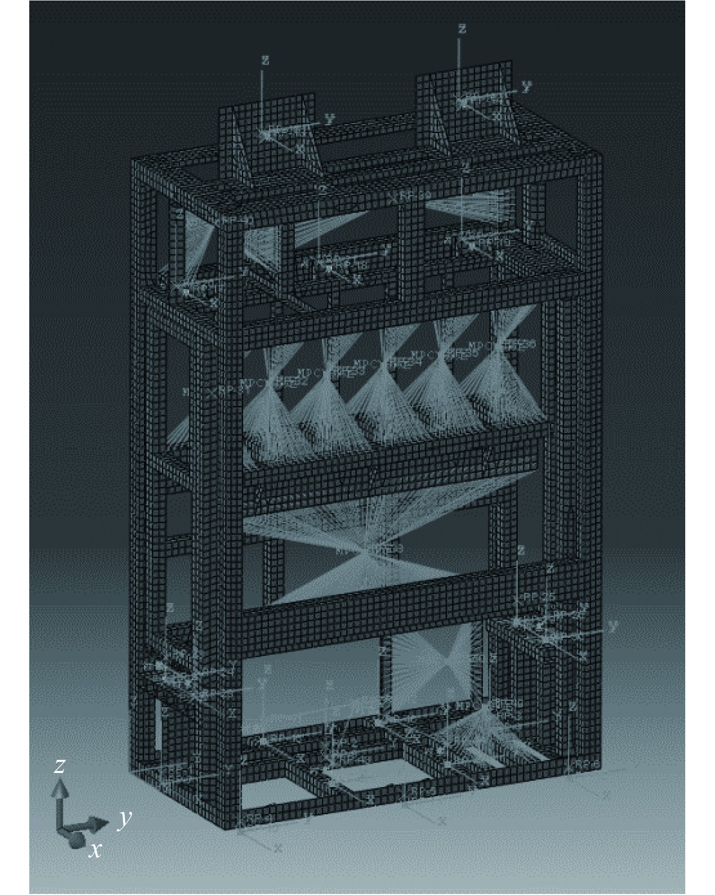 3 软件应用采用某水面舰上的柜体设备作为典型算例,展示本文构建的船舶设备抗冲击评估系统的实际应用效果。该柜体设备抗冲击等级为A,安装在船体主甲板上,属乙类设备;通过减震器与基座连接,属弹性安装条件;冲击后不允许产生永久变形,属弹性设计。该柜体设备在Abaqus软件中的有限元模型显示效果如图6所示,模型中包含C3D4、S4、S3单元类型,含有壳、体属性。