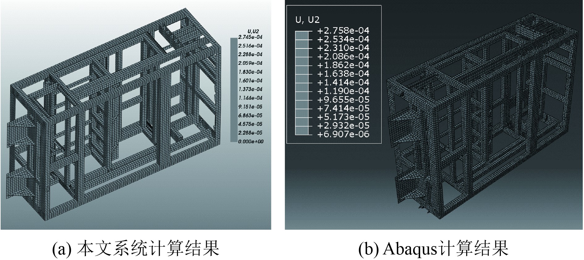本系统的后处理效果和商用CAE软件Abaqus的对比结果如图7所示,两者的位移计算结果分布相同,图7(a)中本系统计算出的位移响应峰值为2.745×10−4,Abaqus计算出的位移响应峰值为2.758×10−4,两者的偏差小于0.1%,符合预期要求。