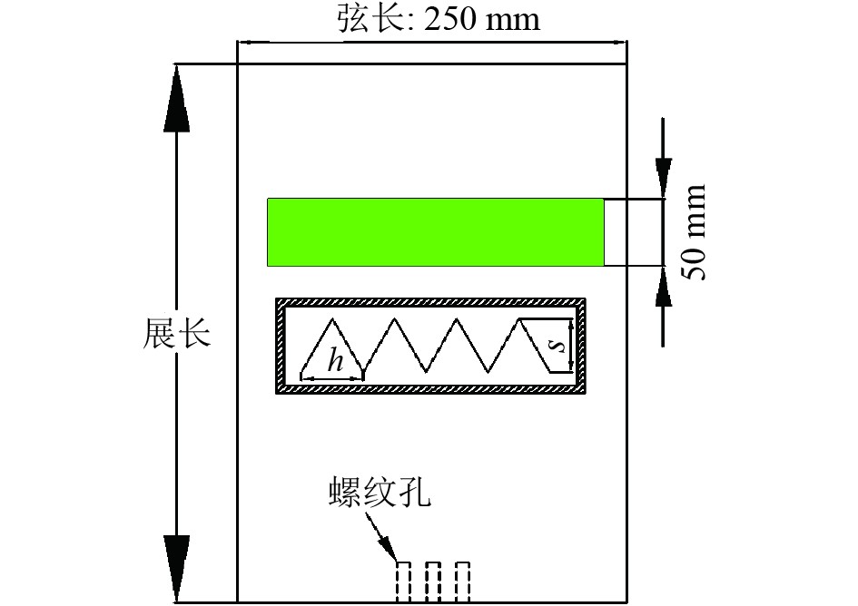 试验沟槽选取三角形沟槽,该沟槽形式在平板的减阻研究中具有良好的减阻效果且易于加工。WALSH等[3]采用试验方法总结大量不同尺寸参数、尺寸类型和试验工况的沟槽减阻性能规律,给出了具有良好减阻性能的无量纲尺寸h+、s+选取范围及计算表达式为:
