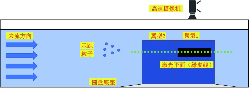 图3和图4分别为翼型PIV流场试验测试示意图以及试验效果图。试验中用到的 PIV 系统包含高速相机,激光器,示踪粒子以及软件系统。激光器是 Litron Laser 公司生产的 LDY Dual Power 304型PIV激光系统。试验所用的示踪粒子为 Dantec 公司生产的聚酰胺,粒子直径为20 μm。在水洞试验段上方放置高速相机,相机为CMOS芯片的8G内存的Speedsense9072相机,分辨率为